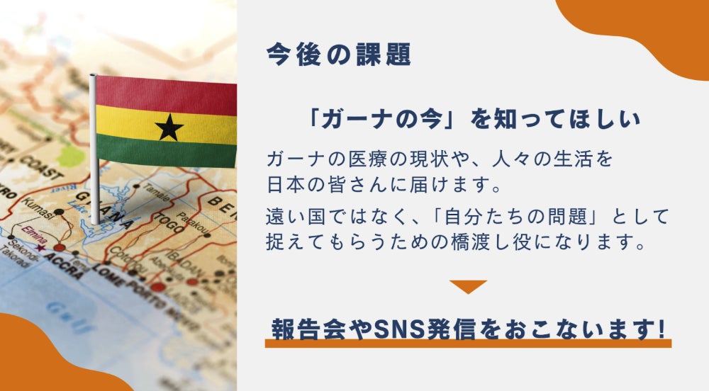 2026/04/15 10:56平素より当団体の活動を暖かく見守り、ご支援いただきありがとうございます。皆さまの温かい応援により、クラウドファンディングプロジェクト「ガーナのワクチンの課題に挑む! 暮らしの中で育む健康習慣 ~未来の子どもたちへ~」は目標を達成し、現地での活動を完遂することができました。本当にありがとうございました!この感謝の気持ちを込めて、私たちが現地で出会った「最高に魅力的なガーナ」を丸ごと体験できるイベント、「Ghana Tour Showcase」を4月19日(日)に開催いたします!また、会場の確認等のため、ご案内が遅れまして誠に申し訳ありません。対面及び一部アクティビティに関してはオンラインでも体験できますのでぜひご参加いただけたらと思います…!このイベントは、皆さまと共に作り上げたプロジェクトの「活動報告会」でもあります。ガーナでの調査活動を通じて見えてきたワクチンの課題や、現地の「暮らし」に根ざした健康習慣について、写真や映像を交えて熱くご報告します!また、これからの活動について、支援者の皆さまと直接お話しできる機会をメンバー一同楽しみにしています。4つのアクティビティでガーナを体感!この度共同主催の「GSU(ガーナ学生連合日本支部)」とともに、ガーナのHappinessを詰め込んだプログラムをご用意しました。Talk & Discussion :現場を知るゲストを迎え、ガーナの医療や社会のリアルを深掘り!現地でのリアルなエピソードをお届けします。Made in Ghana Products:ガーナ自慢の特産品をチェック!美味しいチョコレートやはちみつなど、現地の恵みを感じてください。Cultural Expo:色鮮やかな伝統衣装、音楽、アート、食文化、自然・観光名所など、ガーナの誇る多様な文化を丸ごと展示します。Social Interaction :在日ガーナ人学生と交流したり、ノリノリのアフロビーツに合わせて踊ったり!心を通わせる最高に楽しいひとときをお楽しみください!本イベントは、在日本ガーナ大使館にも広報協力をいただいている、公式なショーケースです。【開催概要】 日時: 4月19日(日)10:00 AM – 3:00 PM 会場: 東京科学大学 湯島キャンパス(東京都文京区湯島1丁目5番45号)2階 共用講義室 入場料:一般:1,000円 / 大学生:800円 ※クラウドファンディング支援者の皆さま、および高校生以下は【無料】です! ▼ 詳細・お申し込みはこちら https://forms.gle/eAxWeoSNvQP389A46オンラインは午前、午後の2部制で開催いたします。午前の部 11:00~12:30午後の部 12:30~14:00オンラインではガーナトリップの概要、ゲスト・プレゼンターを交えてのパネルディスカッション、渡航メンバーによるポスタープレゼンテーションを予定しています。皆様とお会いできることを心待ちにしております! もっと見る