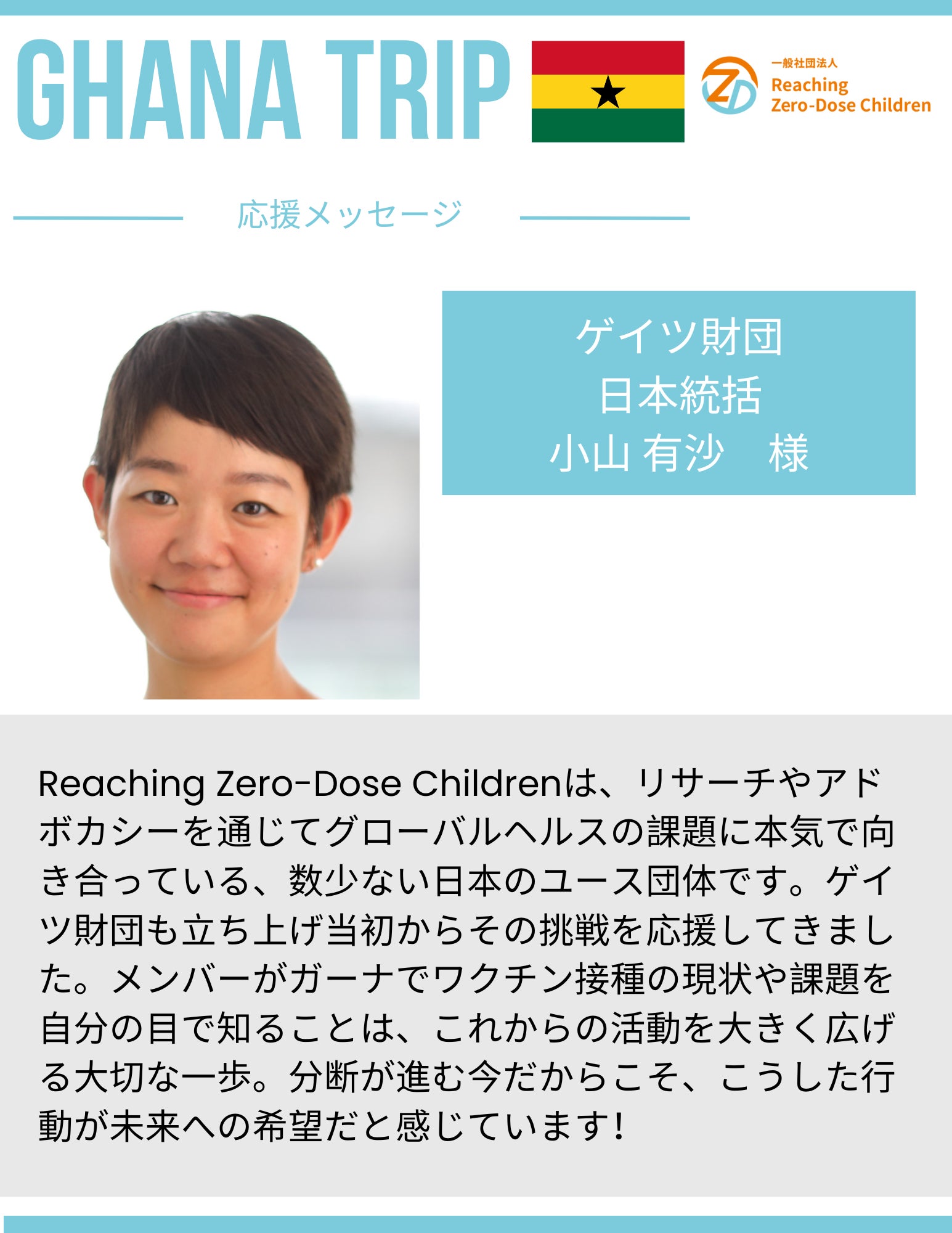 《イベント告知!》現地ガーナから中間報告会を開催します!日頃から一般社団法人Reaching Zero-Dose Childrenの応援をありがとうございます。ガーナトリップ期間中に現地とつなぐオンラインイベントを実施します!現地に渡航して見たこと、聞いたこと、感じたことを渡航メンバーからいち早くお届けします。ぜひご参加ください!《イベント詳細》日時:2月22日(日)9:00~10:00(日本時間)会場:オンライン参加登録フォーム:https://forms.gle/TPw1EuSBAo3xyZZc7リポストなどで拡散もしていただけると嬉しいです!応援よろしくお願いいたします。クラウドファンディングの詳細はこちら↓https://camp-fire.jp/projects/912415/view