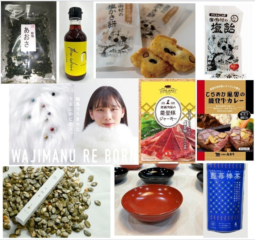 能登の名産品の輪島のあおさや、大人気の「奥能登塩田村」さんの揚げ浜塩を使った塩飴、塩かき餅、被災現場からレスキューされた漆器、噛むほどに味が出て来る能登豚ジャーキー、畜産農家さんだから実現できた贅沢に能登牛がごろごろ入った能登牛カレー、イカが定番の中、癖を抑え使いやすく開発された「メギスのいしり」、都内でも人気の「ひらみゆき農園」さんの新商品「ブルーベリー棒茶」と、飲食だけでなく、輪島塗の技術を後世に伝える使命を持って生まれた〝輪島初のファッションブランド「ヌシヤ」〟のピアスとイヤリング、そして震災当時、高校生だった子たちが起業して、廃棄されるはずのかぼちゃの種を使って開発したネイルオイル!とビューティーグッズまで揃えての豊富なリターンメニューです。