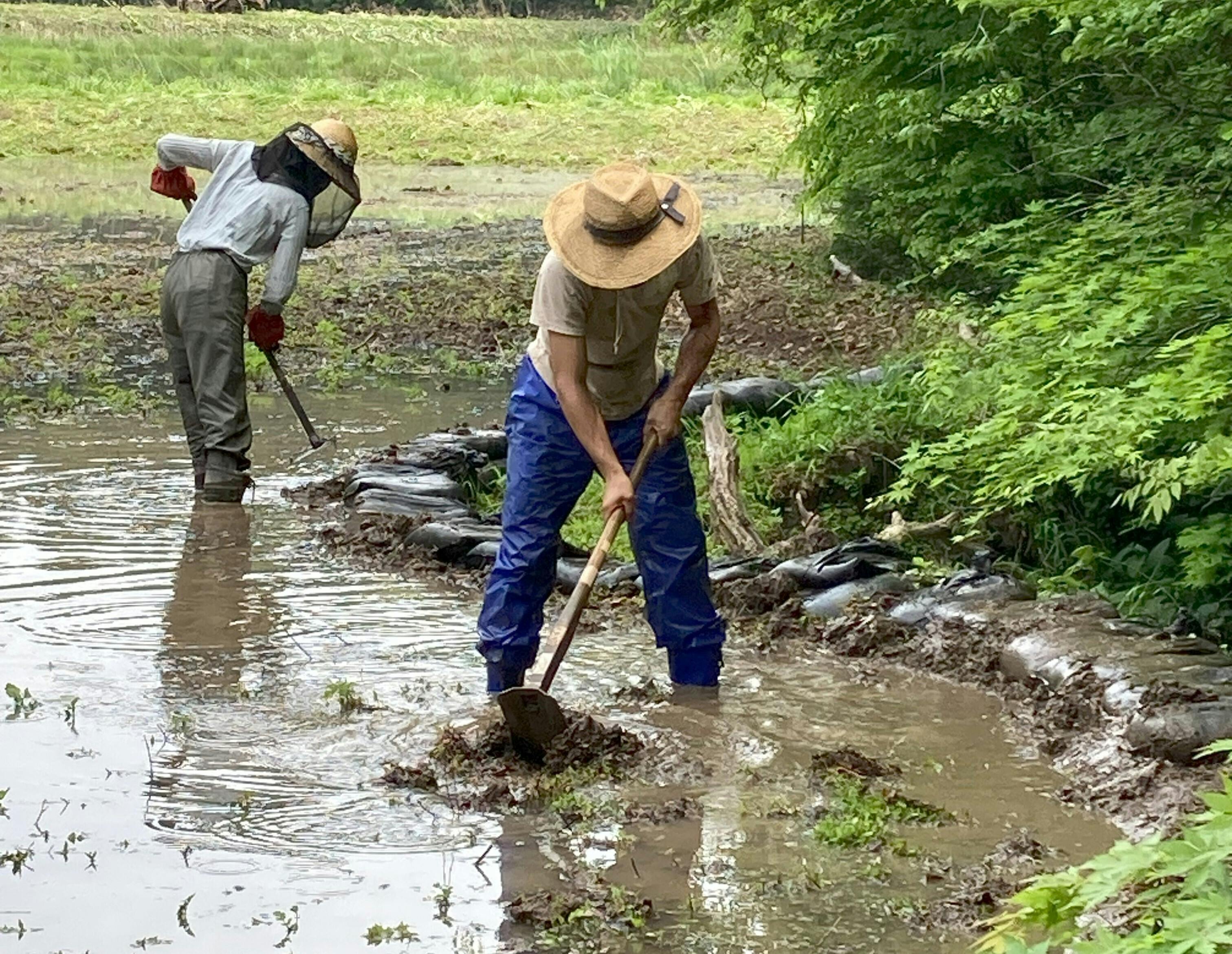 [2025年5月時点、田んぼの畔を直し、田植えの準備を手伝うボランティアスタッフ]