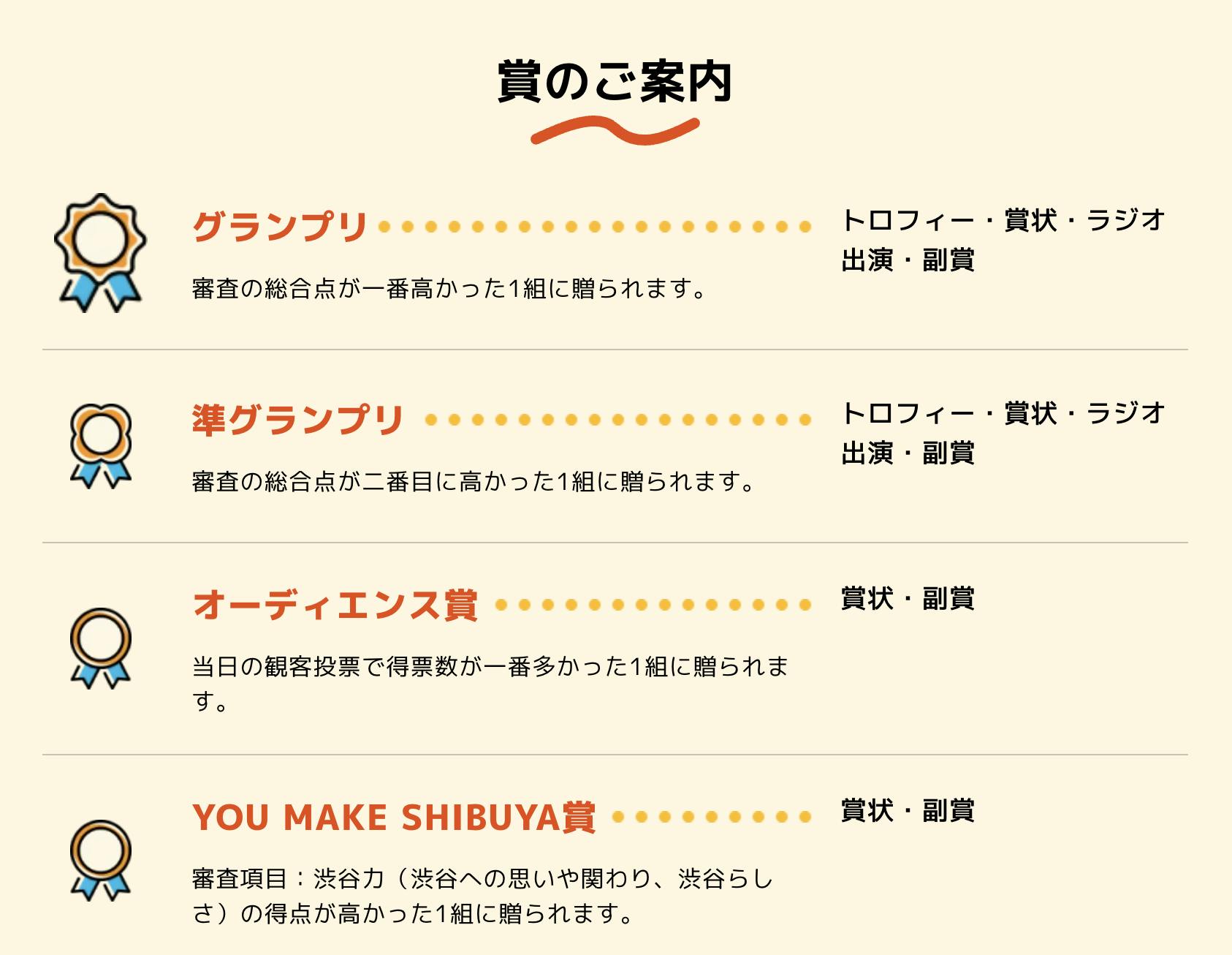 もちろん、目指すは「グランプリ」ですが、渋谷でまちづくりにコミットしている立場として、最低でも渋谷への愛を示した人に送られる「YOU MAKE SHIBUYA賞」は獲らないと…!