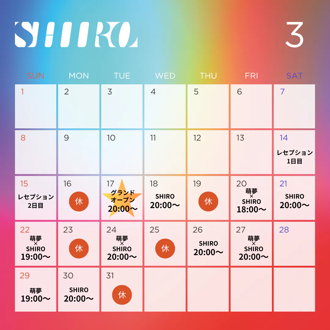 「SHIRO」が書かれている日(「休」と「萌夢」単体の日以外)は、おりますので、是非遊びに来てください!