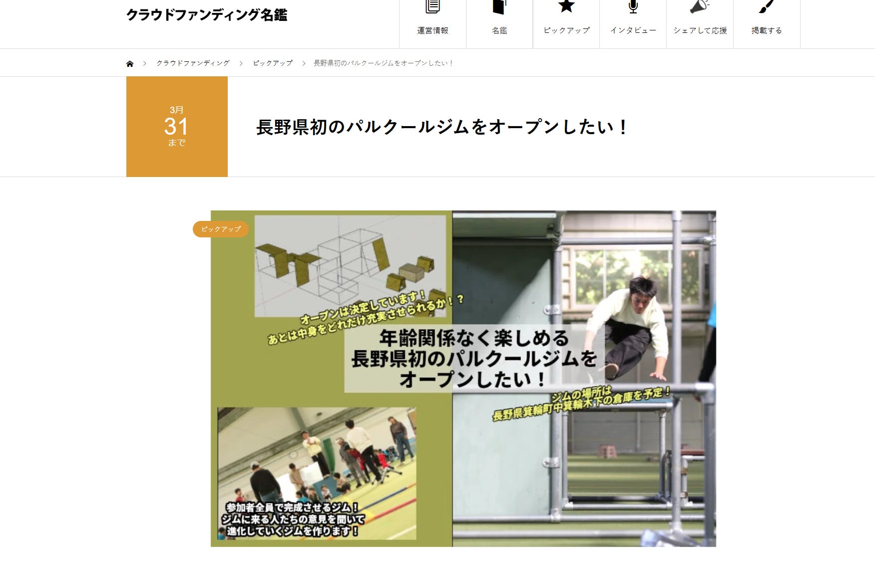 昨日、クラウドファンディング開始すぐにクラウドファンディング名鑑というサイトにこのプロジェクトを掲載していただきました!とてもありがたいです。僕たちの活動を知っていただける機会にも、パルクールのことをもっと知っていただけるような機会にもなるのかなと思っています!クラウドファンディングのスタートダッシュは個人的に好調なのかなと思っていますが、ここからが本番ですね、私も頑張っていかねば!!クラウドファンディング名鑑のさいとはこちらからいけるので、もしよかったら読んでいただけると嬉しいです!https://crowdfunding.meikan.org/project/campfire-912549/