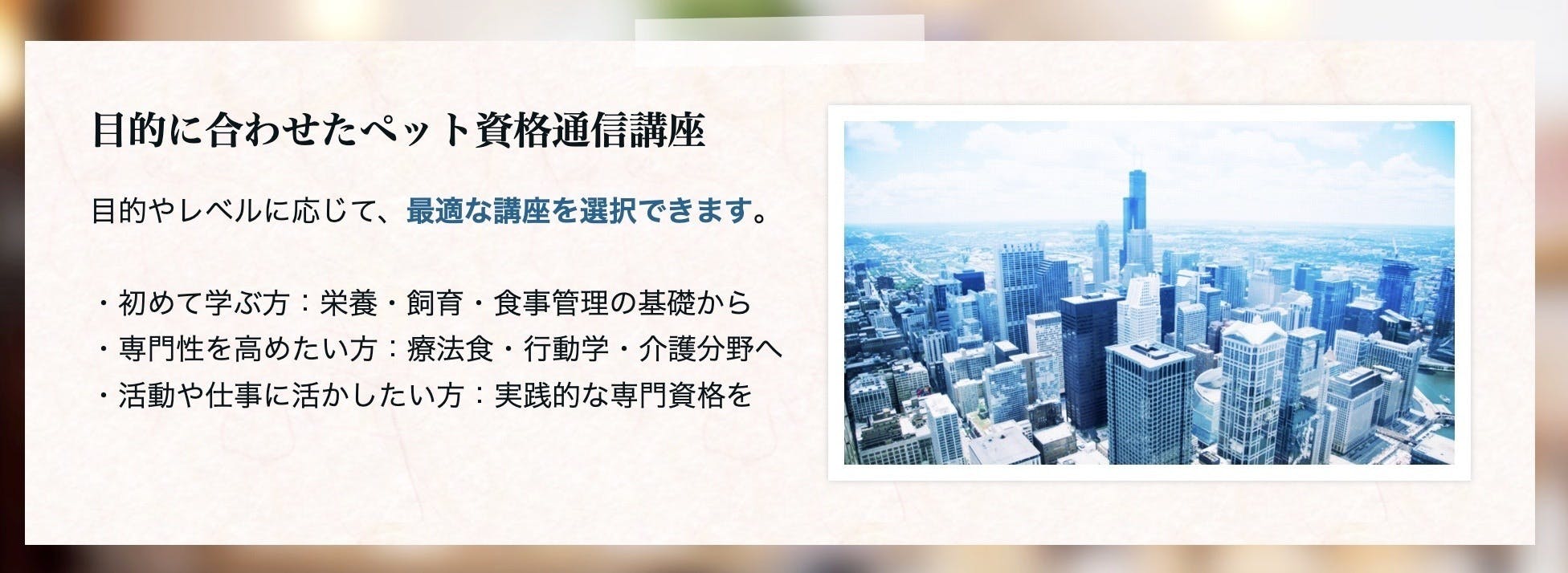 愛犬や愛猫のためにペットの食育、行動学(しつけ)、健康管理、介護を自宅で勉強して資格取得ができる通信教育講座で、是非動物保護シェルター運営の継続、及び拡大にご協力ください。