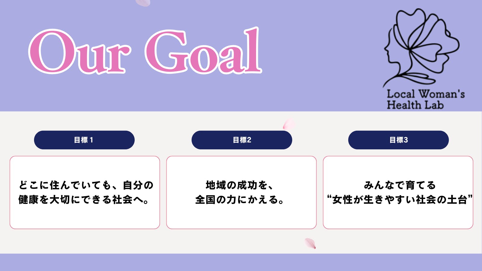 ここで私たちの「Woman's Health」とは、女性が自分らしく生きられる環境を整えるすべてと捉えています。健康とは、身体的な健康だけでなく、精神的な健康、そして社会的な健康が含まれます。女性が元気に、自分のやりたいことができ、そして満たされている、そんな社会を作っていきます。そのためには、健康ももちろんですが、働き方、コミュニティ、支援制度――これらを支える仕組みづくりが必要です。