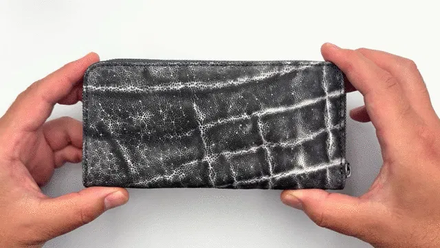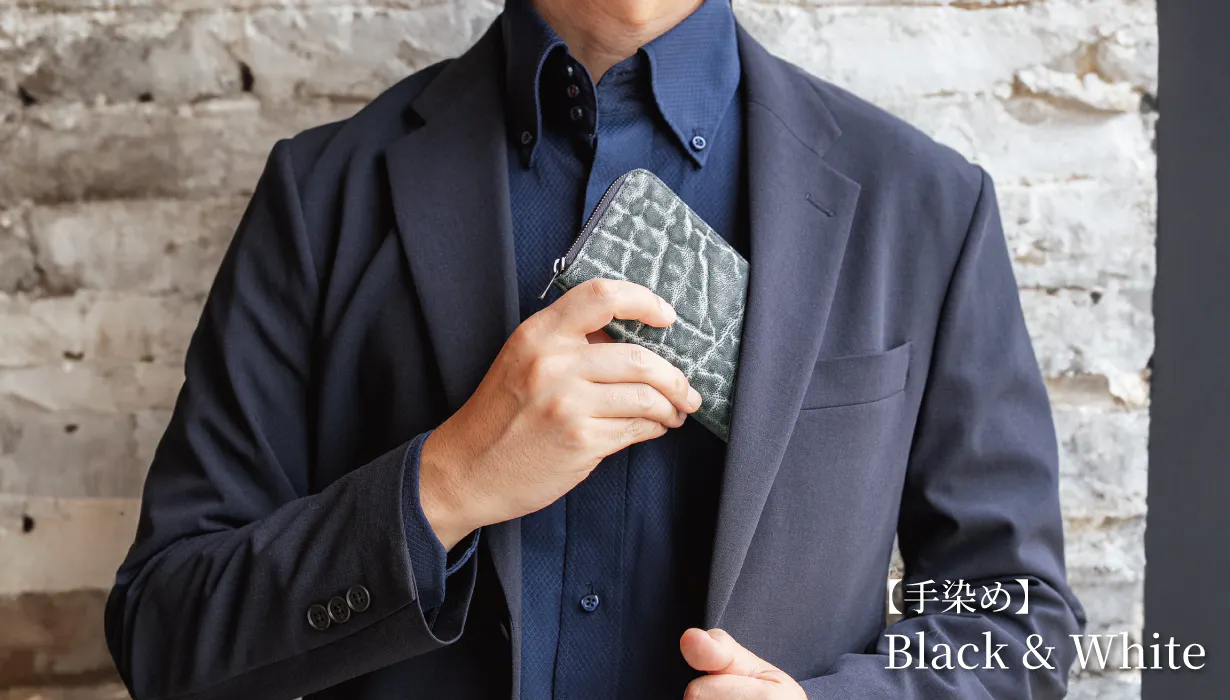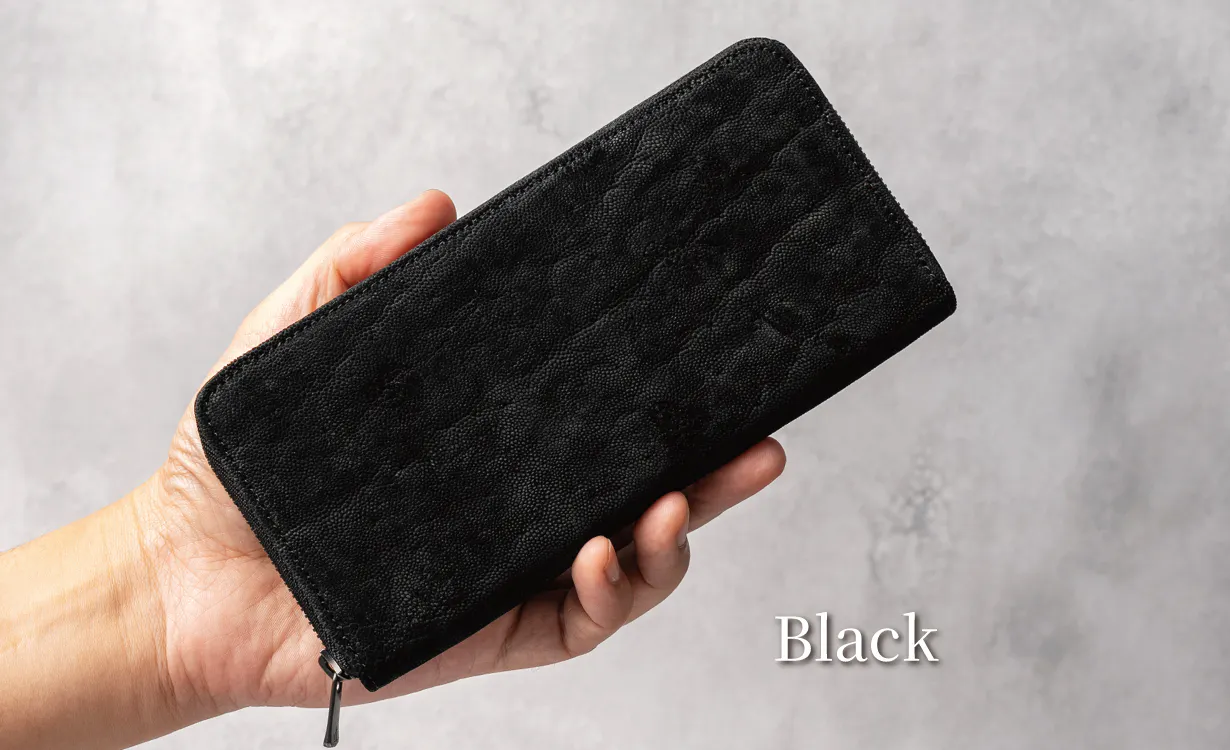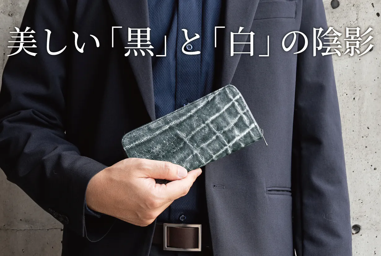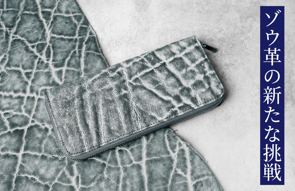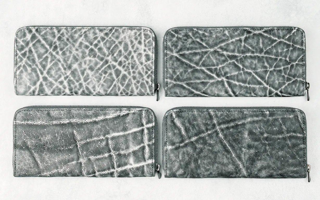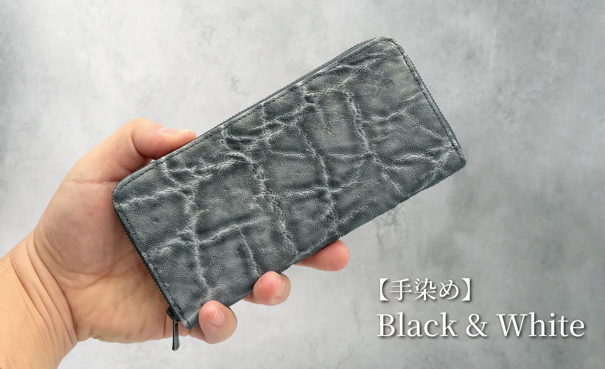 エレファントレザー(象革)は牛革など他の皮革に比べてとても希少価値が高いレザーです。今回は希少価値の高いエレファントレザーを職人が革一枚ずつ手染めで色乗せを繰り返し、エレファントレザー特有のシワの中に色が落ちないように丁寧に仕上げ、黒と白の美しい陰影が表現できるように染め上げました。