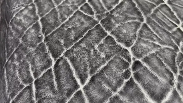 エレファントレザーは厚みがあり、コシのある質感と特有のシボ、独特な深いシワがあるのが特徴です。(使用部位によっては個体差によりシワが無いところもございます)見た目とは異なり、柔らかくしっとりとした肌触りが特徴です。
