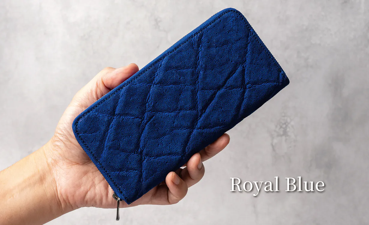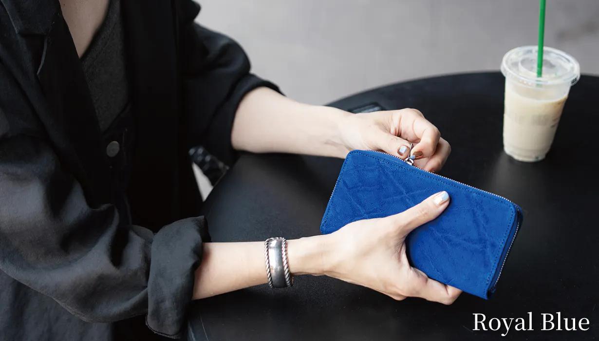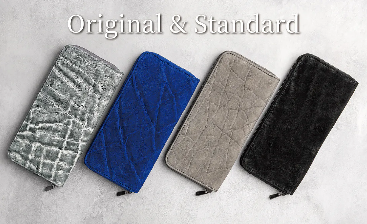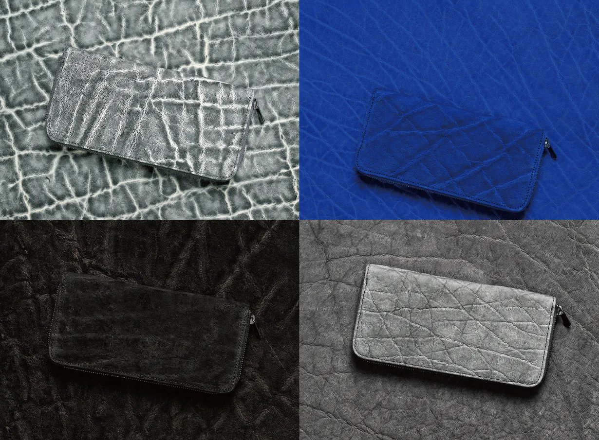 エレファントレザー(象革)は基本色のブラック・ブラウン・グレーでの展開が多いのが現状の中、私たちは常に新しいカラーで挑戦をさせていただきます。先ほどご説明した「手染めブラックホワイト」のほかに、「ロイヤルブルー」、定番の「エレファントグレー」「ブラック」を提案します。