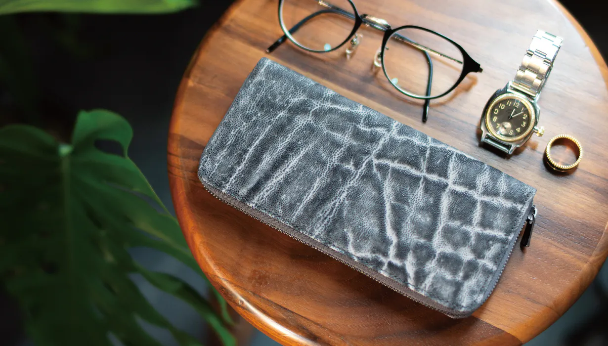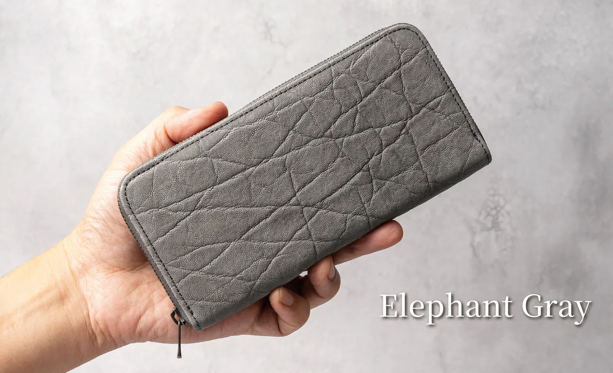 エレファントレザー(象革)は、牛革など他の革に比べて、シワ・シボの入り方が独特で個体差を楽しめる革です。希少性が高い上に、使用する部位・場所によって様々な表情を見せてくれるため、全く同じ見え方がしない唯一無二の革です。
