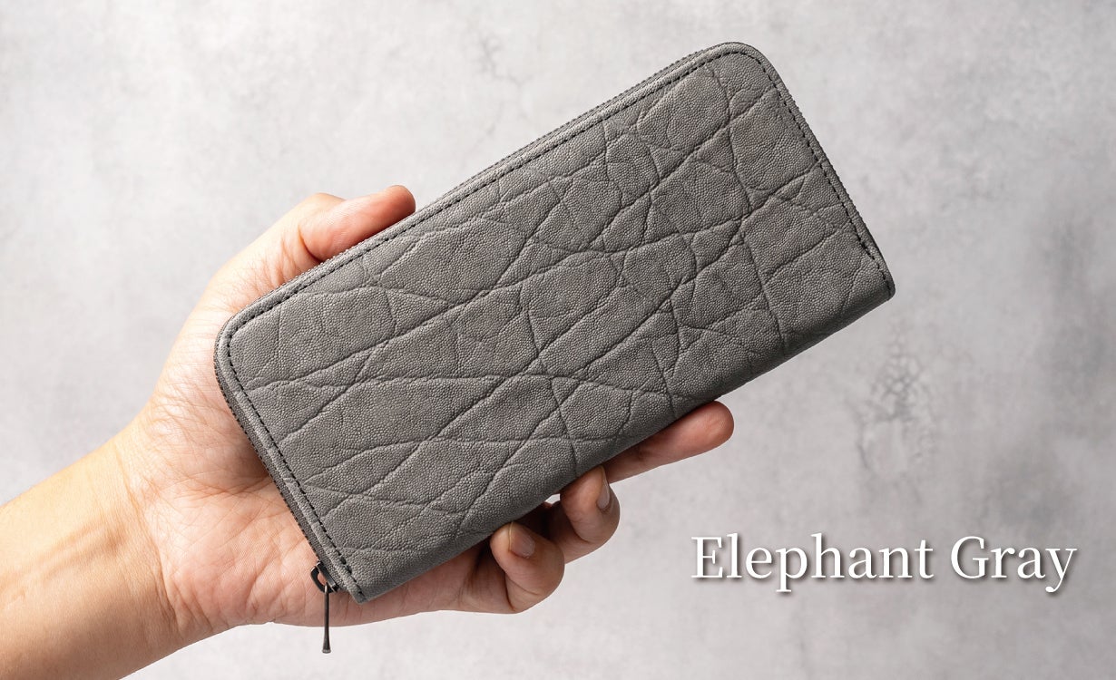 エレファントレザー(象革)は、牛革など他の革に比べて、シワ・シボの入り方が独特で個体差を楽しめる革です。希少性が高い上に、使用する部位・場所によって様々な表情を見せてくれるため、全く同じ見え方がしない唯一無二の革です。