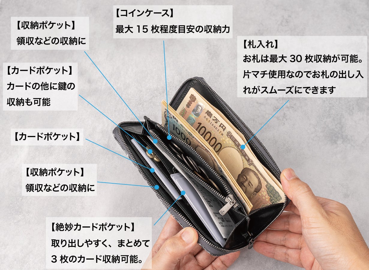 一番大きい一万円札が入るジャストサイズに仕上げています。