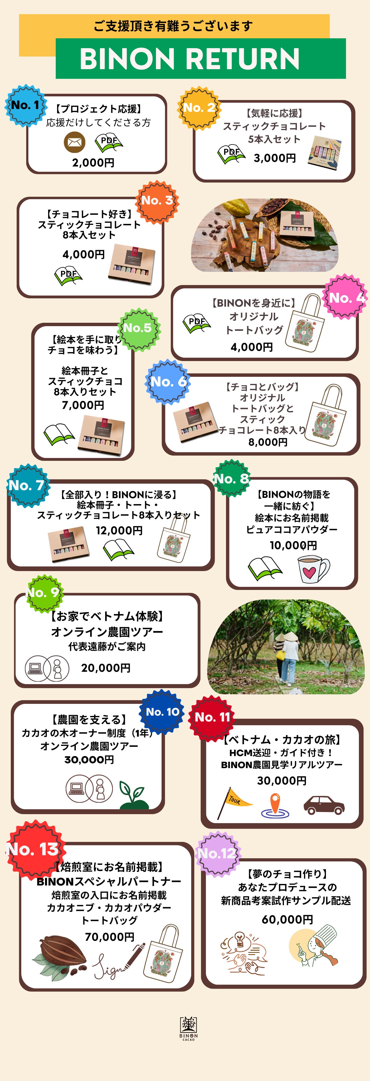 送迎付きの「現地農園ご招待ツアー」や、一緒に新フレーバーを考える「あなたのアイデアを形に」、そして「焙煎室へのお名前掲示」など、BINONのパートナーとして共に歩む特別なリターンです。