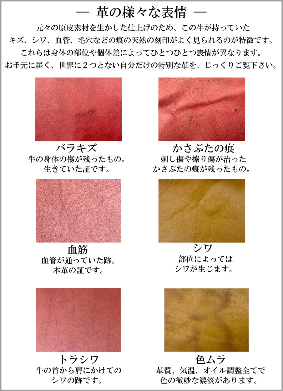内容品は全てデッドストック革の解消を目的とするため、多少のキズ、シミ、シワ等がある部分もあえて余すことなく使用します。