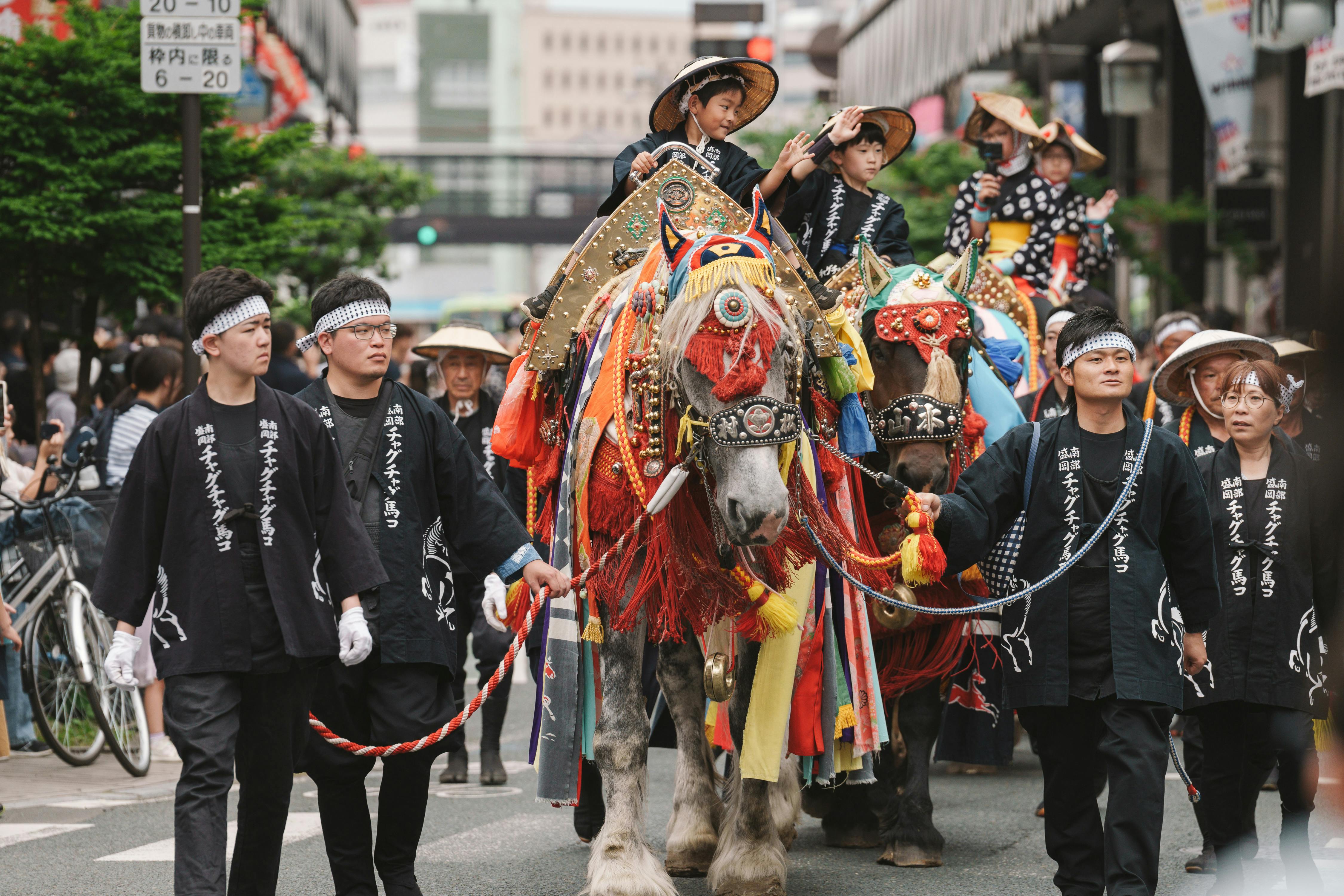 初夏、”チャグチャグ”と鳴り響く鈴の音ともに、南部盛岡の街なかを馬コが練り歩きます。「チャグチャグ馬コ」は、華やかな装束を着飾った農用馬が、滝沢市の鬼越蒼前神社から盛岡市の盛岡八幡宮までの約14kmの道のりを行進する岩手県の伝統行事です。昭和53年には文化庁の「記録作成等の措置を講ずべき無形の民俗文化財」に選定、平成8年には環境庁(当時)の「残したい日本の音風景100選」に選出されています。馬産地として有名であった岩手県で、ともに農作業を行う農用馬の無病息災を祈るために旧暦の端午の節句に鬼越蒼前神社へ参詣した農民たちの文化がルーツとなっています。