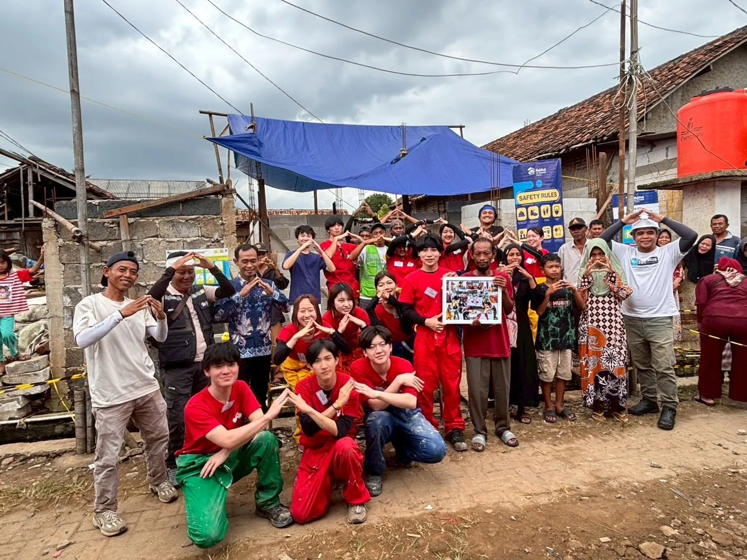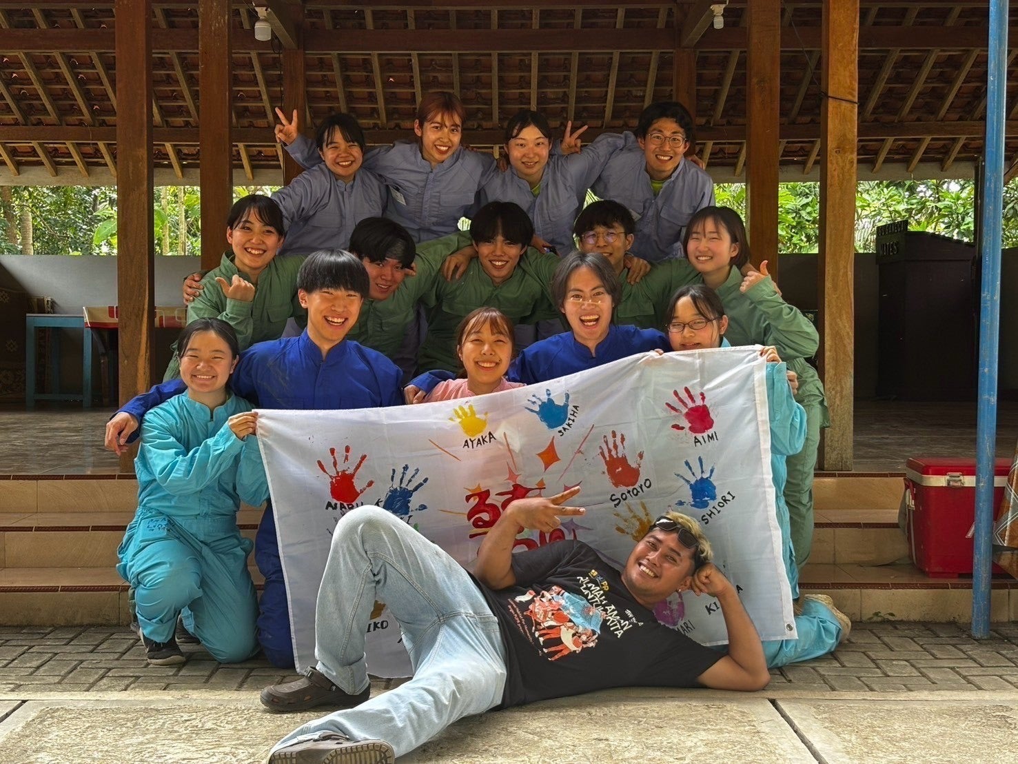 2026/03/06 14:12Selamat siang!!(こんにちは!!)ついにワーク最終日を迎えました!今日は、壁となるブロックの積み上げを引き続き行いました。最終的には10段目まで積み上げることが出来ました!午後には、現地の方々とお別れをするフェアウェルパーティーが行われました。恋ダンスを披露したり、現地の曲で一緒に踊ったりして楽しく交流しました。ワーク中毎日来てくれた子供たちや、言葉が通じなくても優しく教えてくれた現地の大工さん、休憩の場を準備し温かく出迎えてくれたスタッフの方々など、沢山の方々に支えてもらったからこそ、私たちは頑張ることが出来ました。ボランティアをしに行ったのに、私たちがパワーをもらった部分も多かったのが正直なところです。それでも、私たちの挑戦する姿は現地の方々を含め、多くの人を勇気づけられたと思います!!私たちが携われるのはここまでになってしまいますが、家の完成と現地の方々の健康を心から願っています!残り日数わずかですが、最後まで実りある日々を過ごし、全員で無事に帰国します!最後まで応援よろしくお願いします!! もっと見る