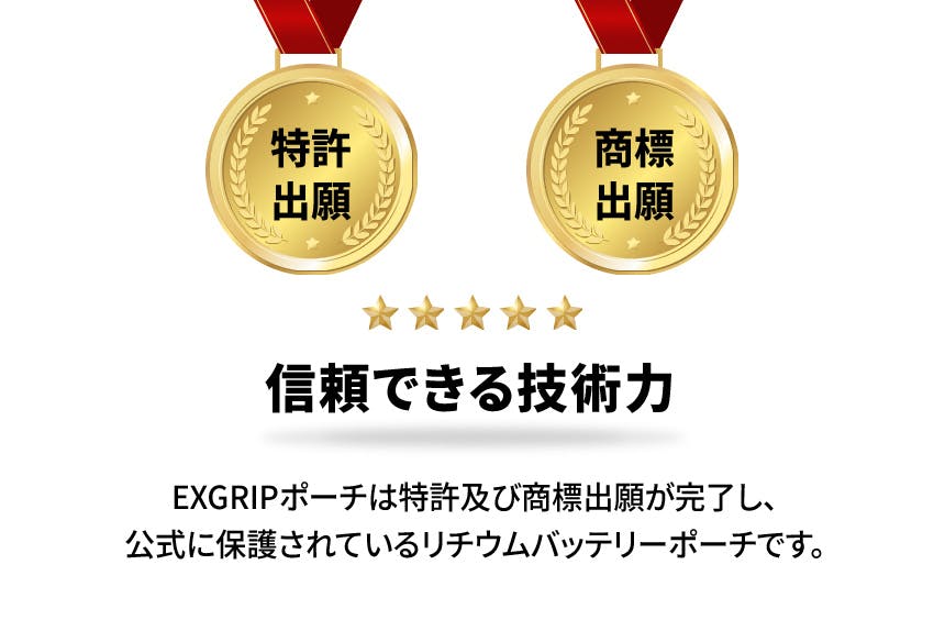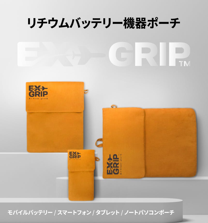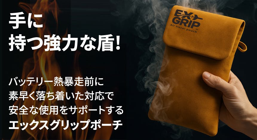 A. EXGRIPは、モバイルバッテリーやノートパソコン用バッテリーを収納することで、バッテリー発火·熱暴走に対応したポーチです。 特殊3層構造生地と耐熱性に優れた縫製でバッテリー熱暴走時初期発火温度800℃の高温にも耐えられます。
