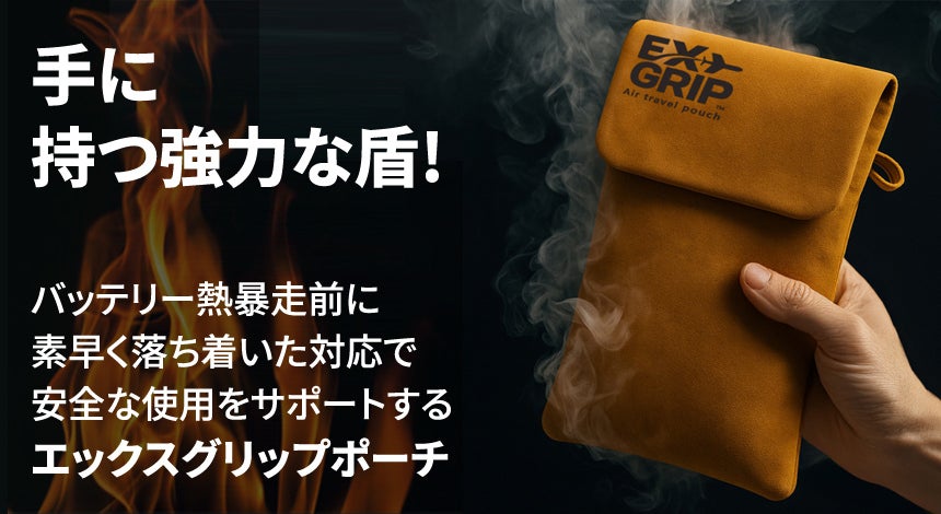 EXグリップは、モバイルバッテリーを機能性ポーチに入れて保管して使用することができ、熱暴走が発生した場合、異常兆候(煙、音)が発見されれば、直ちに安全な場所にポーチを移動させ、迅速な対策と火災鎮火で2次被害を減らしてくれる熱暴走対応用ポーチです。