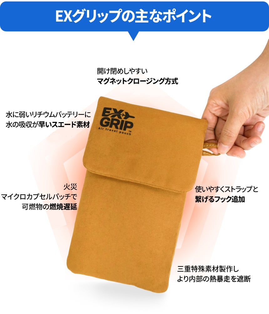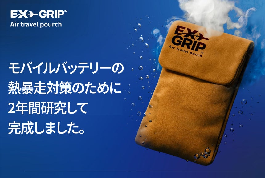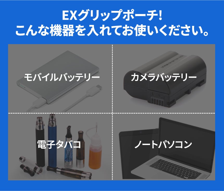 A. EXGRIPは、モバイルバッテリーやノートパソコン用バッテリーを収納することで、バッテリー発火·熱暴走に対応したポーチです。 特殊3層構造生地と耐熱性に優れた縫製でバッテリー熱暴走時初期発火温度800℃の高温にも耐えられます。