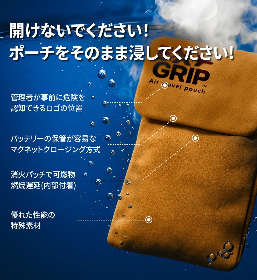 A. EX GRIPの中でバッテリーが熱暴走発生時には収納したまま片手で持って水中に浸水させると良いです。 浸水性スエード生地が素早く水を吸収するため、初期進化にも対応できます。