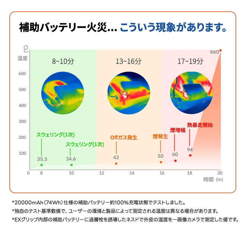 2026/01/13 12:00リチウムバッテリーの熱暴走はどのようなタイムに対処すべきでしょうか?最新の追加テスト資料を添付します。詳しくお教えします。EXグリップにモバイルバッテリーを保管する際の熱暴走現象は以下の通りです。まず、熱暴走時にはスウェリング現象(EXグリップが膨らむ現象)が発生します。そして。ガスのにおいと微細な煙がEXグリップの外部に出ます。EXグリップを握って移動できるタイムは2番スウェリング現象3番ガス及び煙の排出上記異常現象時に手に取って素早く移動することができます。熱暴走から爆発につながる前に、水中や人の少ない場所に移動する必要があります。バッテリー容量によって異なりますが、 8分から13分の間に移動する必要がありますEXグリップを手で握ることができる時間帯は3分から8分以内です。 もっと見る