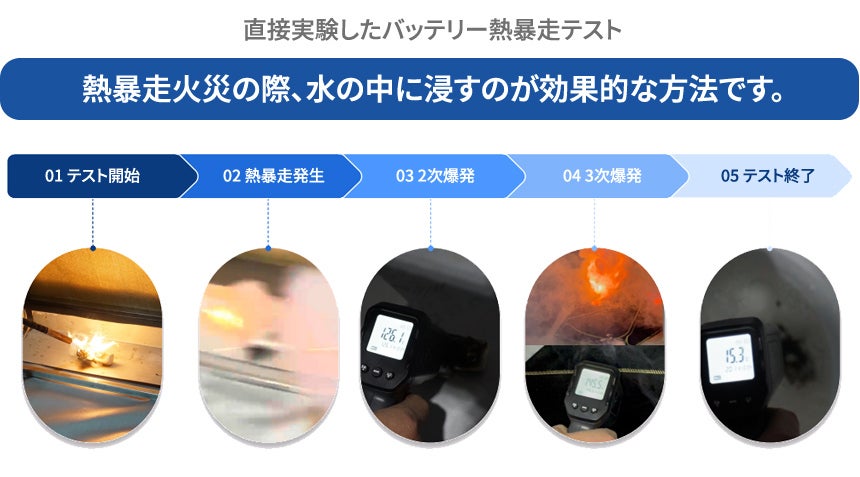 2026/01/12 12:00リチウムバッテリー!使用は便利ですが、リチウム電池火災「熱暴走」あっという間に1000℃まで温度が上がり、容量によって鎮火にはかなり長い時間が必要です。リチウム電池火災の大きな問題は「熱暴走」現象です。リチウムバッテリーは気温上昇や過充電、バッテリー内部不良などで温度が上がると風船のように体積が大きくなりバッテリー内部圧力が大きくなりますが、この過程で分離膜が崩壊し陽極と陰極が直接接触して火がつき急激な温度上昇が起こります。自社で熱暴走現象と変化についてテストしてみました。自社で数十回テストしてリチウムバッテリーの熱暴走時に反応状況を確認しましたが、1次、2次、3次に連鎖反応がありました。01 テスト開始 - バッテリーに火がつきながらガス発生02 熱暴走発生 - 多くのガスと共に水平·垂直に火炎爆発03 2次爆発 - 爆発後も徐々に温度上昇後(~約126度)、2次爆発04 3次爆発 - 防炎布措置にも爆発05 テスト終了 - 浸水液に浸けた後、15~50度まで下がる結局、熱暴走が発生する前に発生する前兆現象である煙、臭いで異常兆候が発生した時に、1次熱暴走が発生する前に落ち着いて移動または水中に浸かることが熱暴走に対する対応の第一歩です。リチウムバッテリーが最も危険なのは、表面的に火が消えても内部の熱暴走によって再び火がつく危険があるので、可能であれば該当バッテリー自体を大量の水に完全に浸して冷却させるのが最も効果的な方法の一つです。熱暴走で慌てた状態で個人ができる最善の方法は、煙や臭いが発生した時に素早くバッテリーを移動させることが最も安全な方法です。 もっと見る
