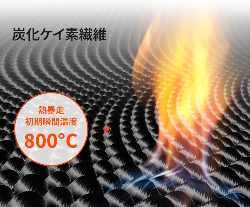 フェルトタイプに織られた厚さ2.2mmの柔軟で稠密な機能性耐火生地がバッテリー燃焼により3次爆発までの時間と拡散に役立ちます。
