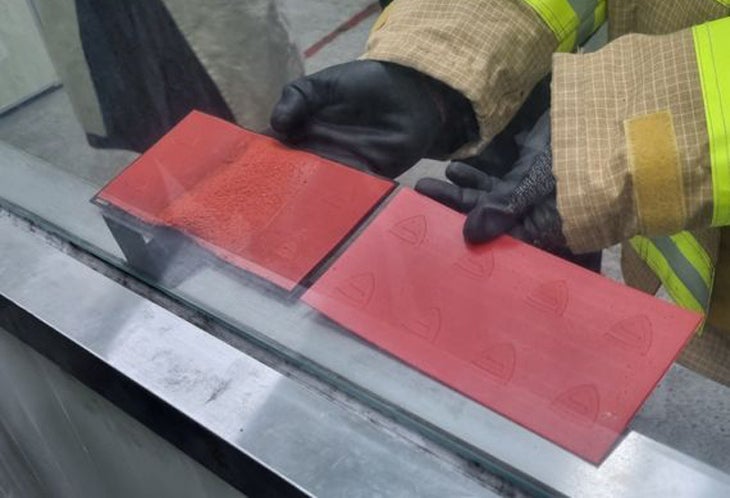 EXグリップ工場でマイクロカプセルの内部に火災パウダーがが含まれているパッチをテスト機の上段に貼り付け、下段には炎を作り、消火試演を韓国消防庁の消防員に依頼して行いました。