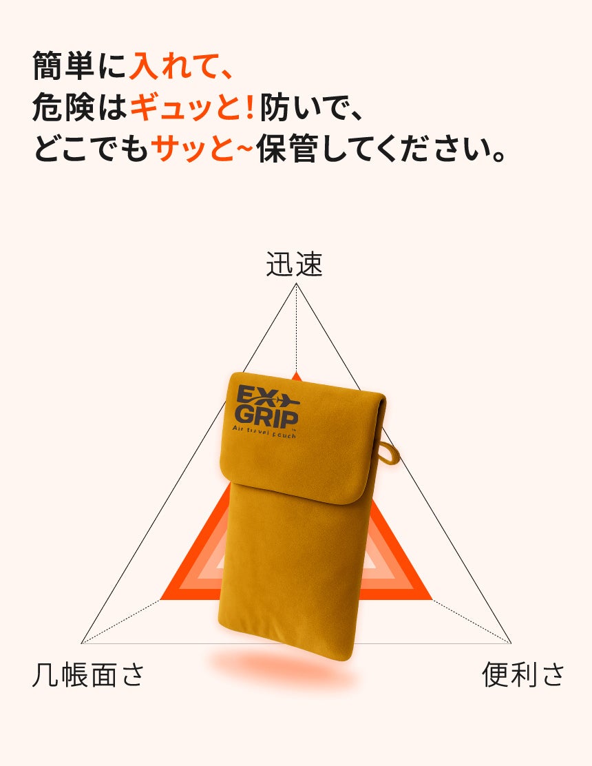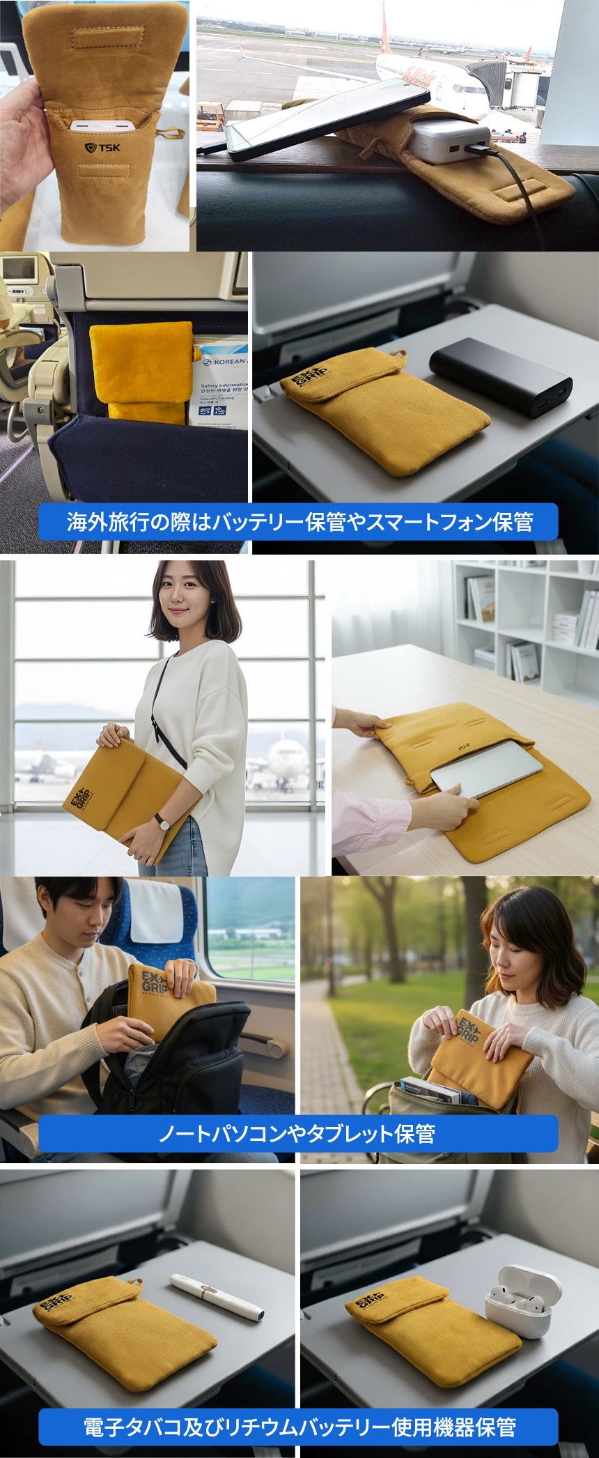 A. はい、機内持ち込みが可能です。 EX GRIPポーチは、補助バッテリーの保管に必要な国際基準(ICAO、IATAなど)を反映した外部短絡防止設計で、機内持ち込みに問題ありません。