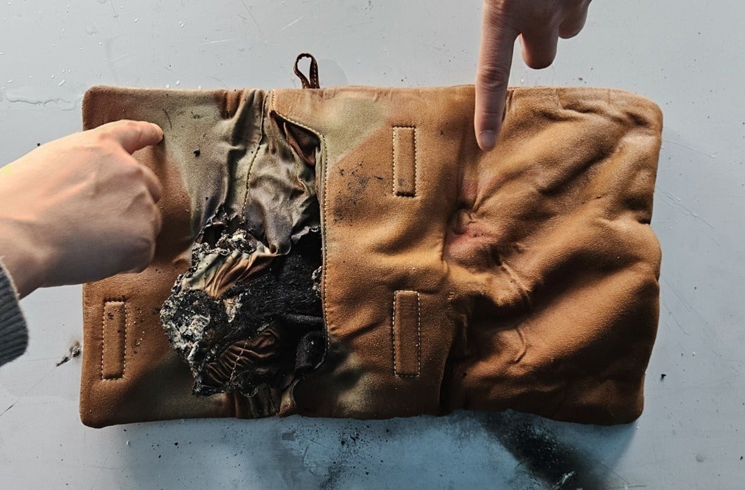ポーチの外部生地は熱暴走時に水に素早く吸収されるスエード素材で、内部炭化生地、火災遅延マイクロカプセルを装着して1次暴走時に対応できる素材を適用して製作しました。