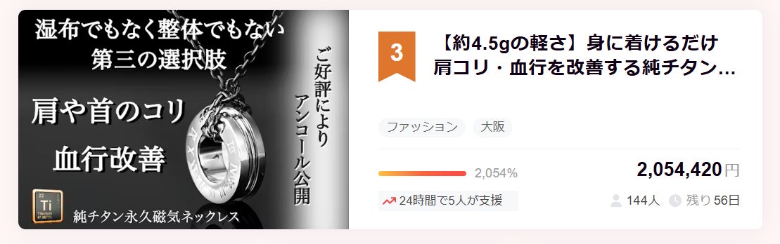 弊社プロジェクトをご覧いただき誠にありがとうございます。ご好評につきアンコール公開開始より間もなく1か月が経ちます!本日付けでファッション部門第3位となっております!!皆様からの多くのご支援のお陰です。[CAMP割18] 限定30個も続々と御購入していただいております。肩こりでお悩みの方は是非この機会に一度お考えしてみてはいかがでしょうか?よろしくお願いいたします。