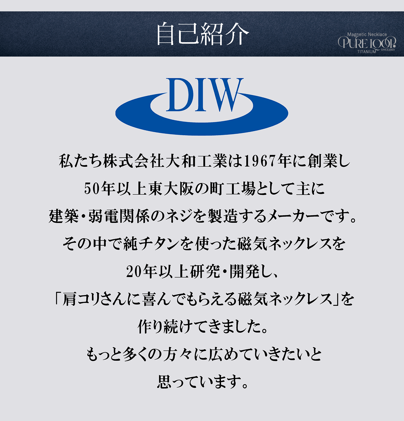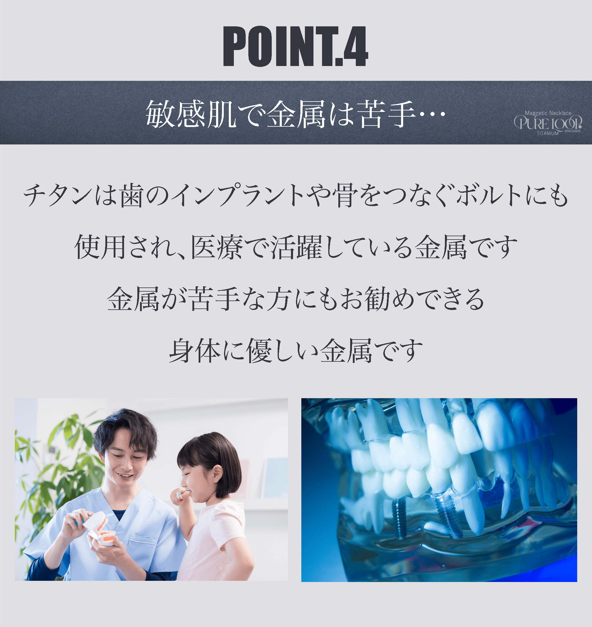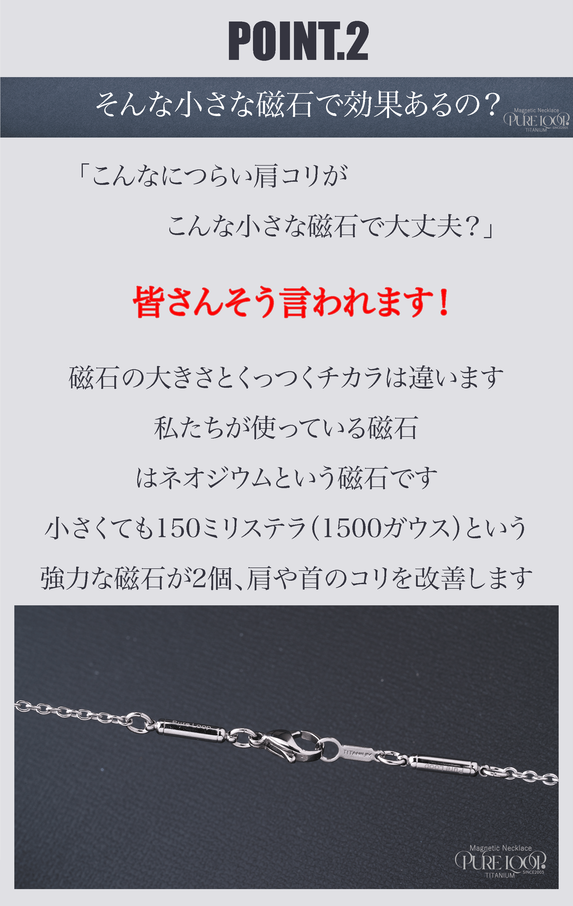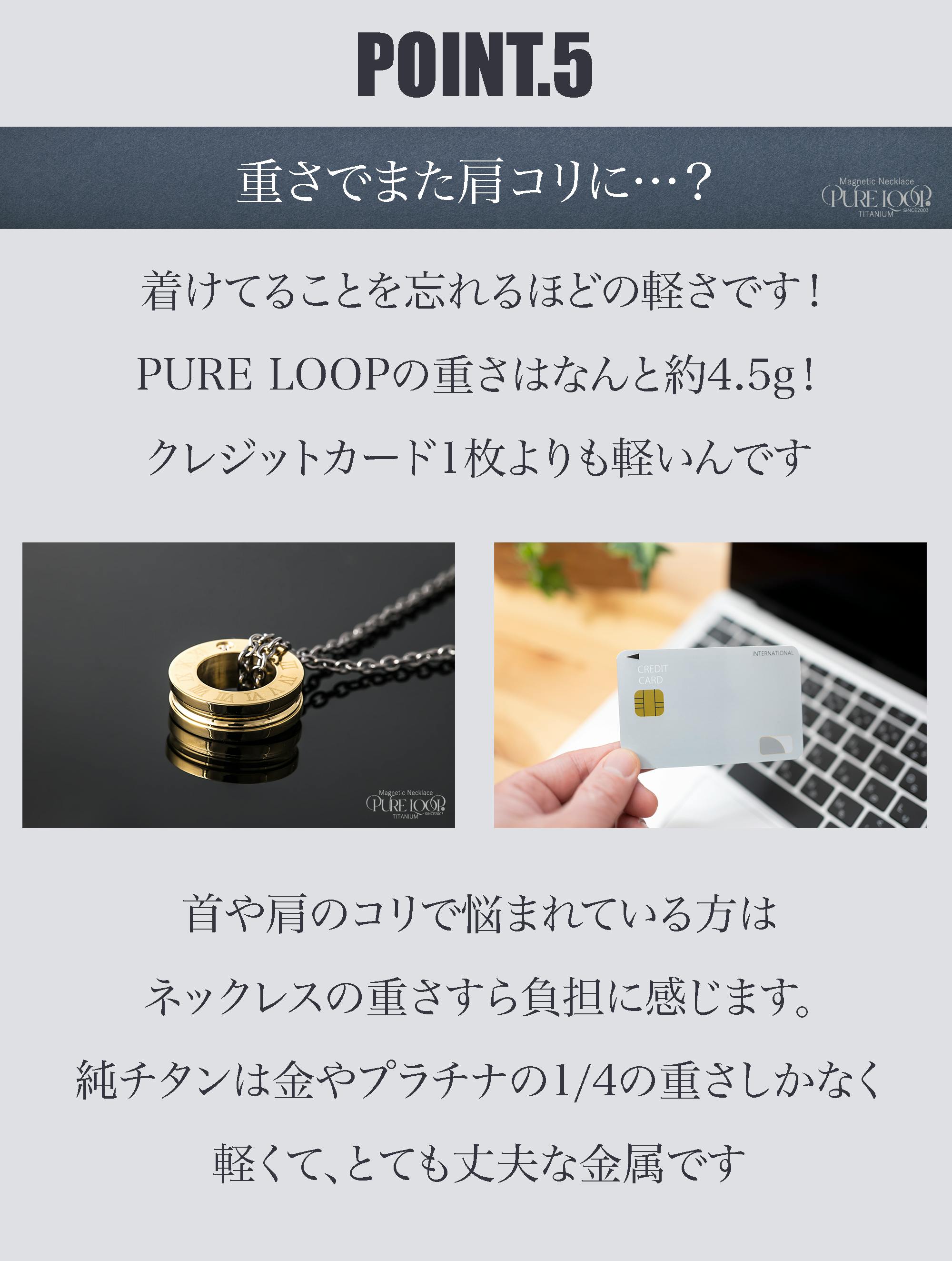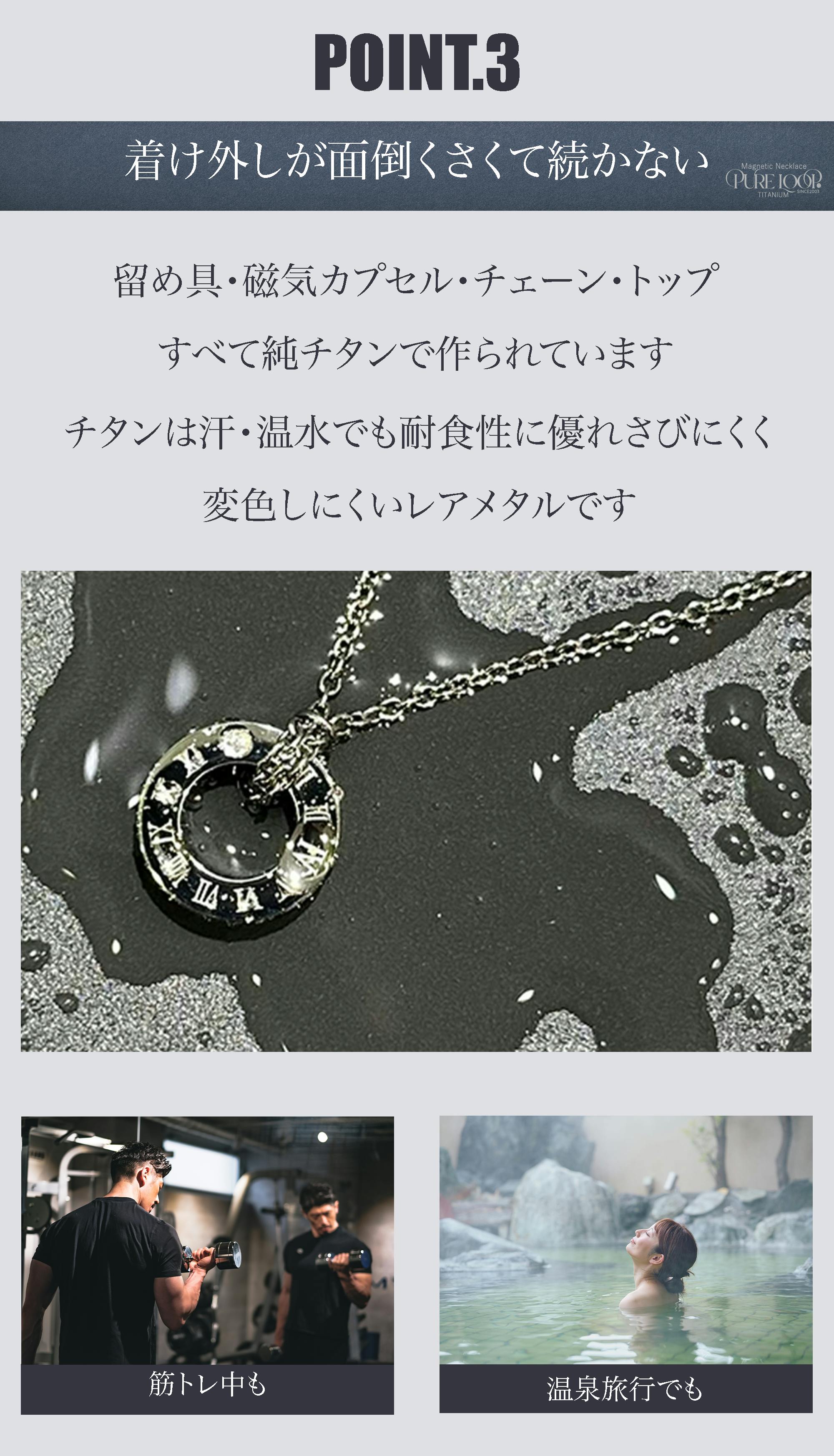 2026/02/16 07:53こちらの「ピュアループ」はトップはもちろんチェーンや磁気カプセル、留め具やその他パーツ全て純チタン99.8%で製造しております。皆様の肌に触れる部分は純チタンのみとなっています。金属アレルギーの方にも優しく、非常に軽いので日常で着けっぱなしで装着していることを忘れてしまいます。お風呂の際もめんどうな取り外しも必要なくそのままご入浴できます。ふと気が付いた時には「肩こり」だったことも忘れてしまいます。皆様のそんなお声をたくさんいただき、スタッフ一同何よりの励みになります。レアメタルの一種「チタン」をぜひご検討いただきたいです。周りの肩こりでお悩みの人へオススメしていただけると幸いです。よろしくお願いします。 もっと見る