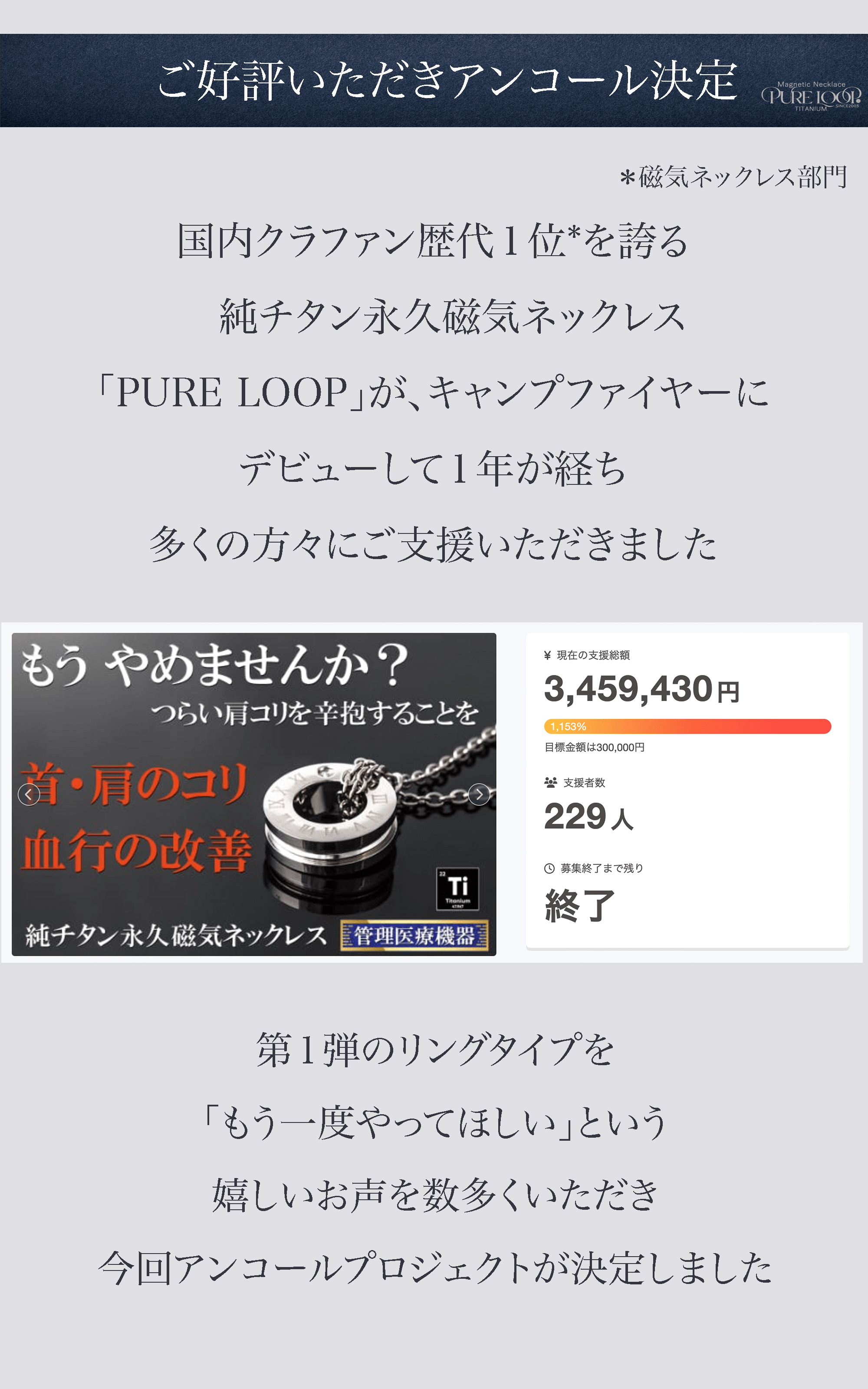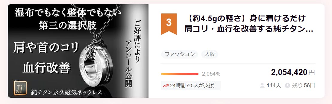 2026/03/04 17:43弊社プロジェクトをご覧いただき誠にありがとうございます。ご好評につきアンコール公開開始より間もなく1か月が経ちます!本日付けでファッション部門第3位となっております!!皆様からの多くのご支援のお陰です。[CAMP割18] 限定30個も続々と御購入していただいております。肩こりでお悩みの方は是非この機会に一度お考えしてみてはいかがでしょうか?よろしくお願いいたします。 もっと見る