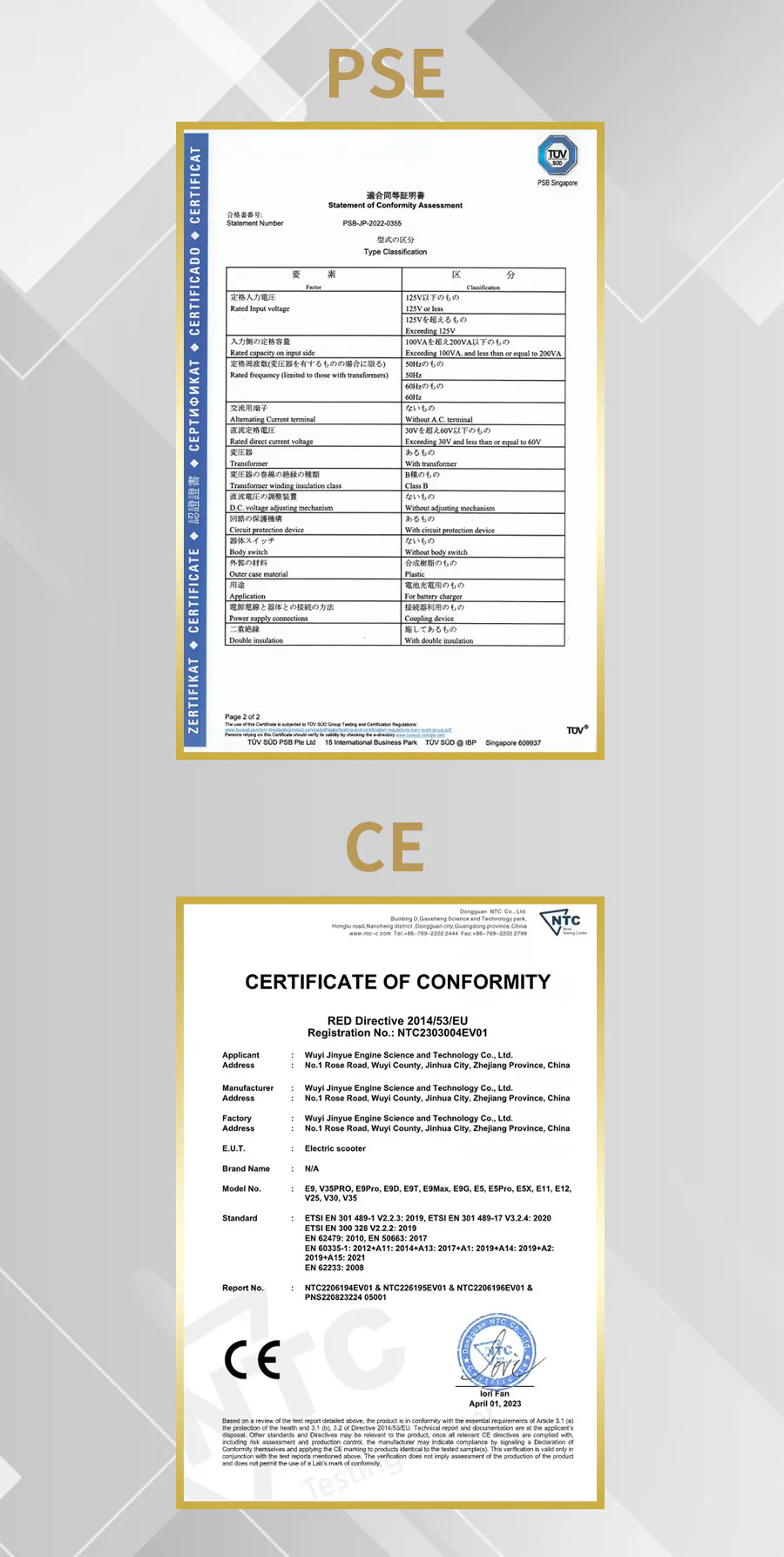 A:PSE認証(TÜV Rheinland発行)およびCE認証を取得しています。