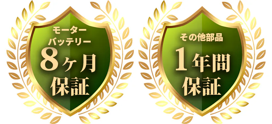 モーター・バッテリーは8か月、その他部品は1年間の保証付き。日本国内でのPL保険にも加入済みで、心配なくご利用いただけます。