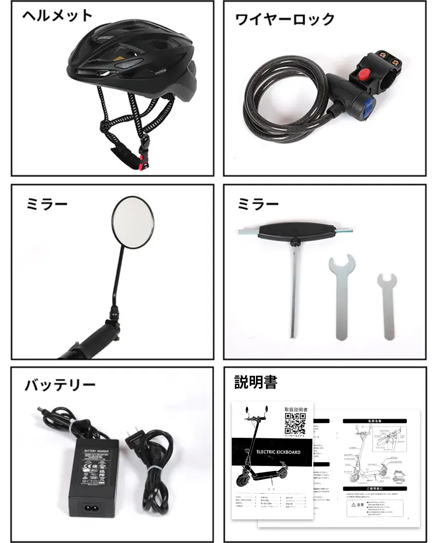 A:本体、ヘルメット、防犯ワイヤーキー、取付金具、工具、QRコード付き取扱説明書が含まれます。