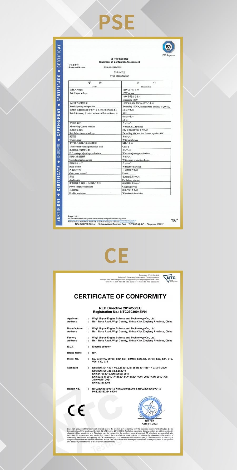 A:PSE認証(TÜV Rheinland発行)およびCE認証を取得しています。