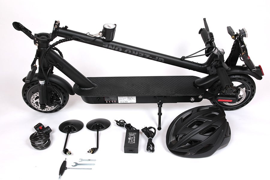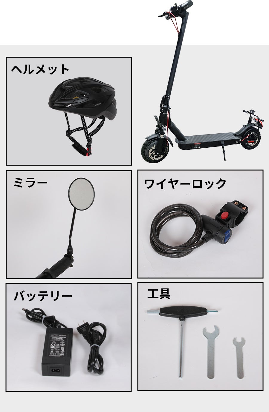 A:本体、ヘルメット、防犯ワイヤーキー、取付金具、工具、QRコード付き取扱説明書が含まれます。