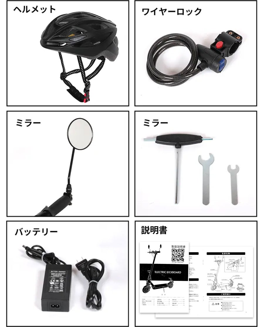 本体、取付金具・工具・ヘルメット・ミラー・盗難防止ワイヤーキー・QRコード付き取り扱い説明書