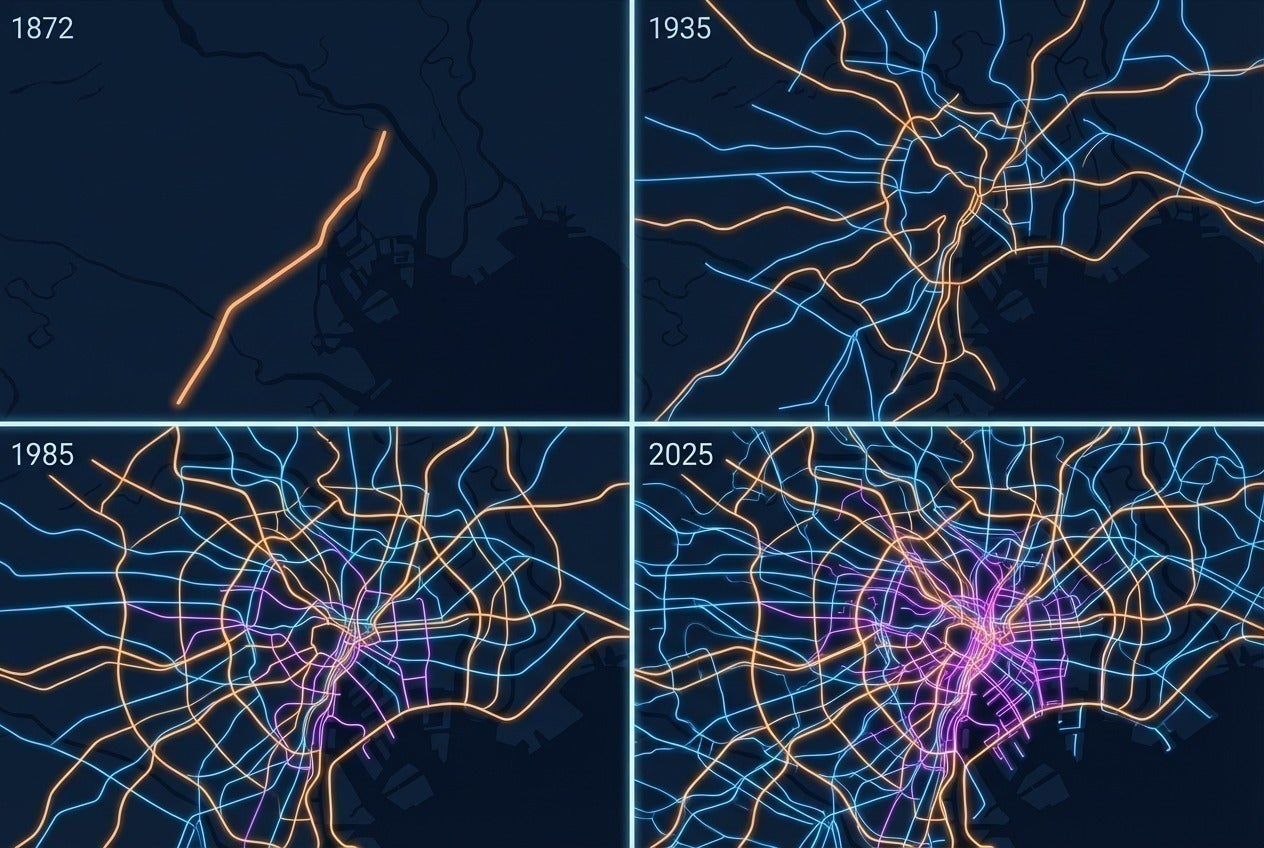 本プロジェクトでは、この1872年を起点として、路線の延伸・分岐・廃線・地下化といった変化を積み重ね、150年にわたる東京圏鉄道史を時系列で可視化します。