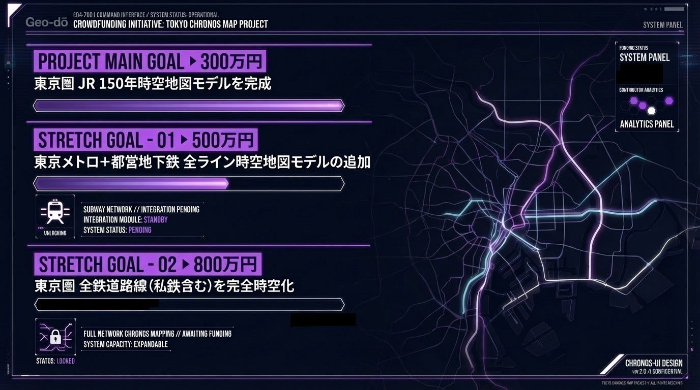 2026/01/05 20:00クラウドファンディング開始から、2週間が経ちました。年始の期間にも関わらず、プロジェクトページを継続して見てくださる方が増えており、少しずつですが関心が積み重なっているのを感じています。この2週間は、東京圏の鉄道史を整理しながら、「なぜこの都市はこの形になったのか」という構造そのものを見直す時間でした。その過程で見えてきた気づきは、noteで連載という形でも記録しています。完成した成果物だけでなく、未完成の地図が立ち上がっていく過程を共有していく試みです。後半に向けては、こうして見えてきた構造を、実際の地図データとして実装するフェーズに入っていきます。引き続き、静かに積み上げていきますので、見守っていただけたら嬉しいです。 もっと見る