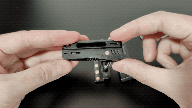 スライド部分を一番奥まで押し込むと、まるで実際のハンドガンを操作しているかのような撃発時の手応えを楽しめます。