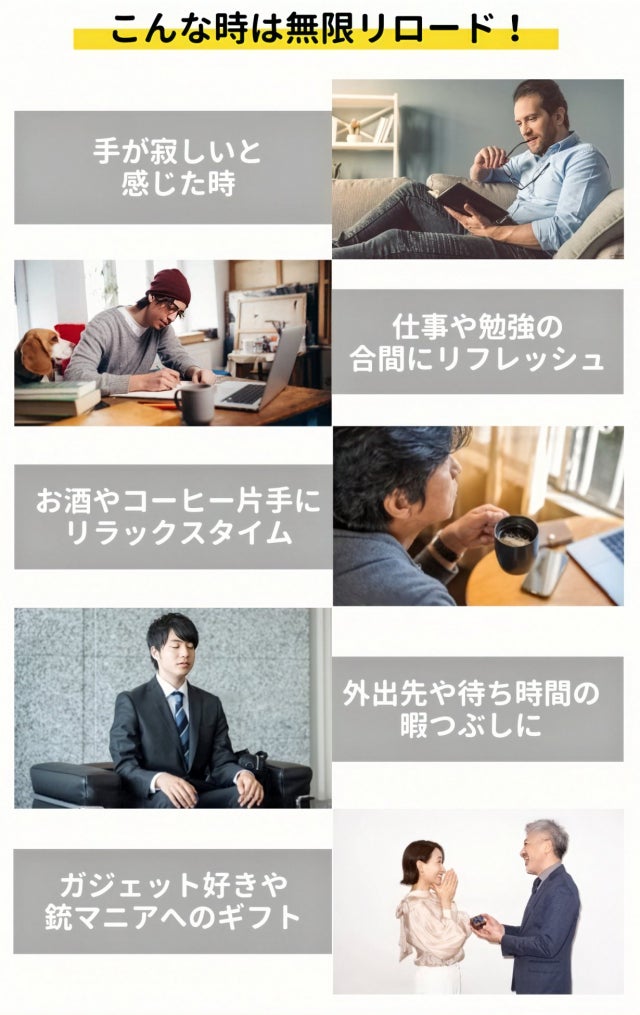 持ち運びに便利なため、自宅やオフィスはもちろん、移動中や外出先でも手軽にリロードの爽快感を味わうことができます。