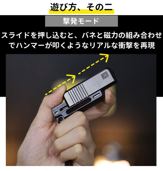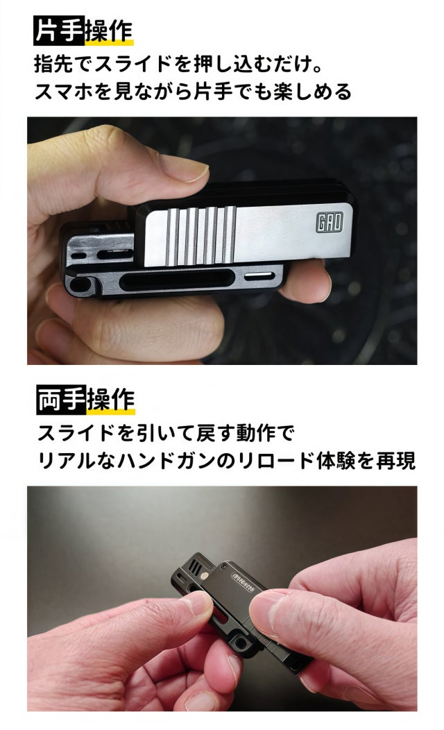 指先でスライドを引き、カチッと鳴る音を楽しみながら、無限に繰り返しリロード動作を行うことができ、何度でも楽しめる新しい体験を提供します。