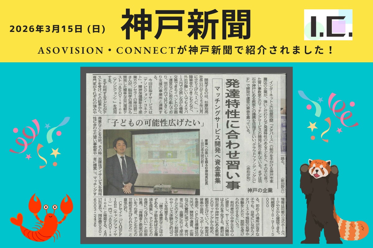 3月15日 (日)付の神戸新聞に、ASOVision・Connectの取り組みが掲載されました!「発達特性に合わせ習い事」というタイトルで、子どもの可能性を広げるというビジョンや、クラウドファンディングへの想いを取り上げていただきました。新聞という形で多くの方にこの活動を知っていただける機会をいただけたこと、とても嬉しく、また身の引き締まる思いです!発達特性のある子どもたちが、自分に合った習い事と出会える環境を目指して、引き続き取り組んでいきます!温かいご支援・応援を、どうぞよろしくお願いいたします!