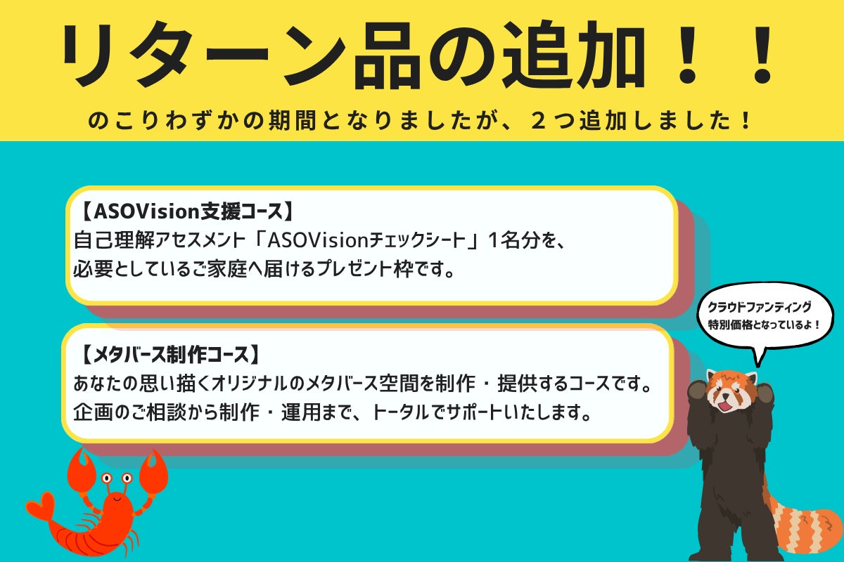 • いつも温かい応援をいただき、ありがとうございます。クラウドファンディングの残り期間もわずかとなりましたが、新たにリターン品を2つ追加いたしました。【ASOVision支援コース】自己理解アセスメント「ASOVisionチェックシート」1名分を、必要としているご家庭へ届けるプレゼント枠です。あなたのご支援が、ASOVisionを必要としているお子さまのもとへ届きます。【メタバース制作コース】あなたの思い描くオリジナルのメタバース空間を制作・提供するコースです。企画のご相談から制作・運用まで、トータルでサポートいたします。どちらもクラウドファンディング限定の特別価格でのご提供です。ぜひこの機会にご検討ください。引き続き、応援のほどよろしくお願いいたします。 もっと見る