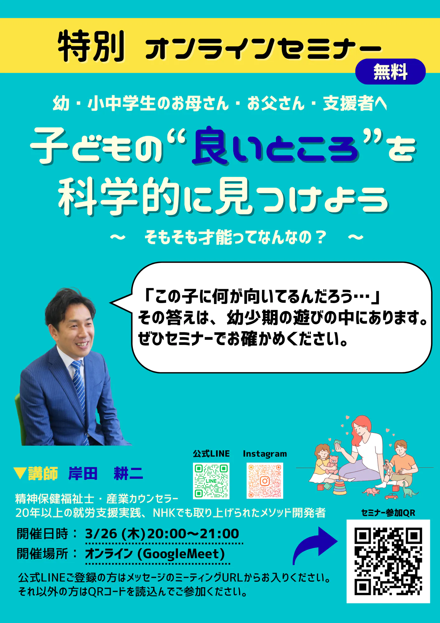 2026/04/01 23:203月26日(木)に、無料オンラインセミナー「子どもの"良いところ"を科学的に見つけよう 〜そもそも才能ってなんなの?〜」を開催しました!講師は、精神保健福祉士・産業カウンセラーとして20年以上の就労支援実践を持ち、NHKでも取り上げられたメソッド開発者である岸田耕二先生。今回のセミナーでは、脳科学の視点から子どもたちの特性を見つける仕組みについて、わかりやすく解説していただきました。「この子に何が向いてるんだろう…」という保護者の方が気になる情報がふんだんに詰まった1時間となりました。今後もこのようなセミナーを定期的に開催していく予定です。次回の開催が決まりましたら、SNSなどでお知らせしますので、ぜひ楽しみにしていてください!引き続き、ASOVision Connectの応援をよろしくお願いいたします! もっと見る