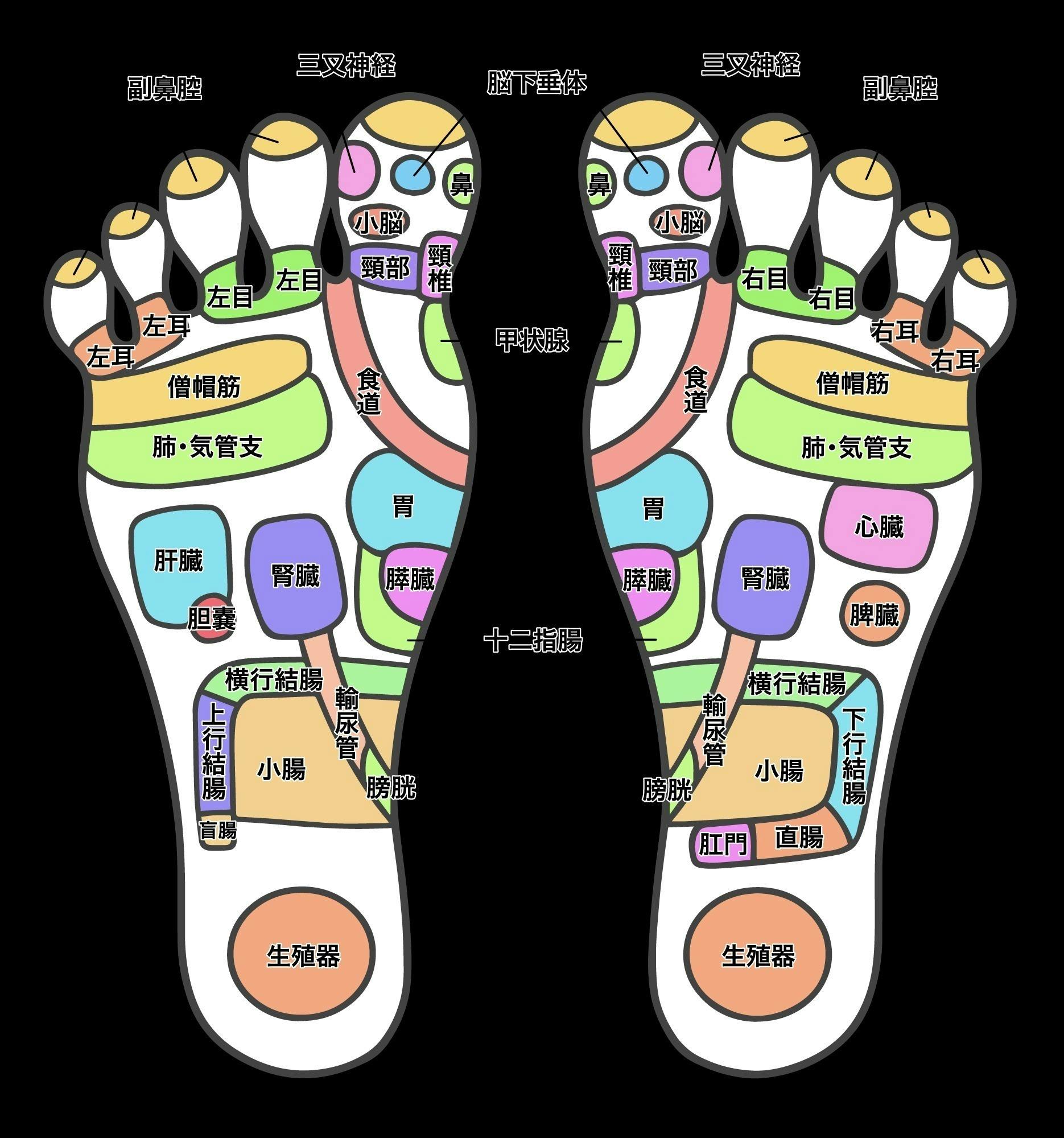 足裏には、60~70個程度の反射区(ツボ)があります。身体の不調が起きた場合、足裏のツボが硬くなったり、カサカサしたり、押すと痛みを感じたりします。この痛みを感じるツボをもみほぐすと、身体の不調を緩和することが可能になります。