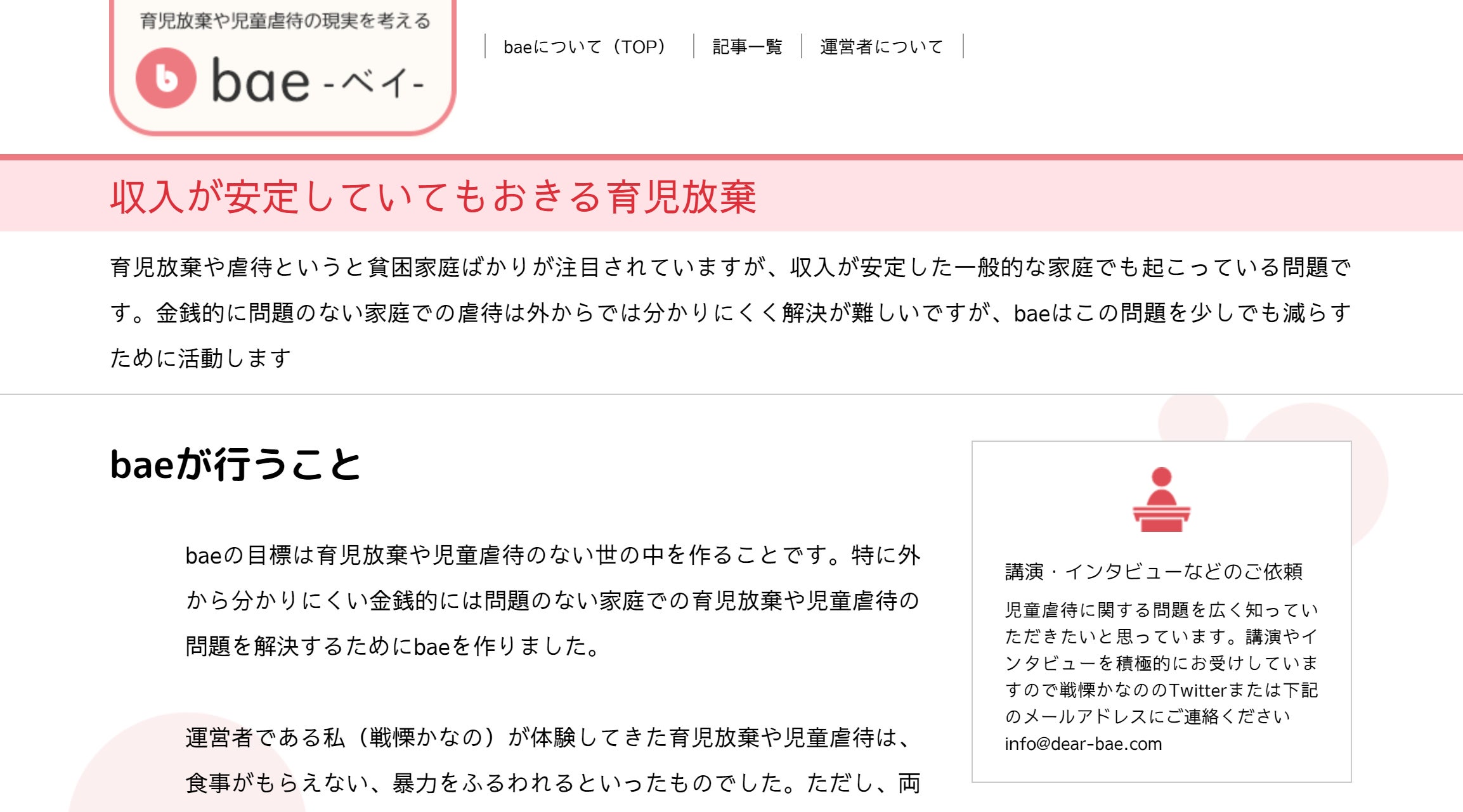 育児放棄は、子供が家族から提供されて当たり前の愛情、食事、衣服がもらえなくなる状態になります。家族はいるのに機能していない、そんな人にとって一時的にでもいいので「家族」や「親友」のように寄り添える存在でいたいという思いがbaeには込められています。