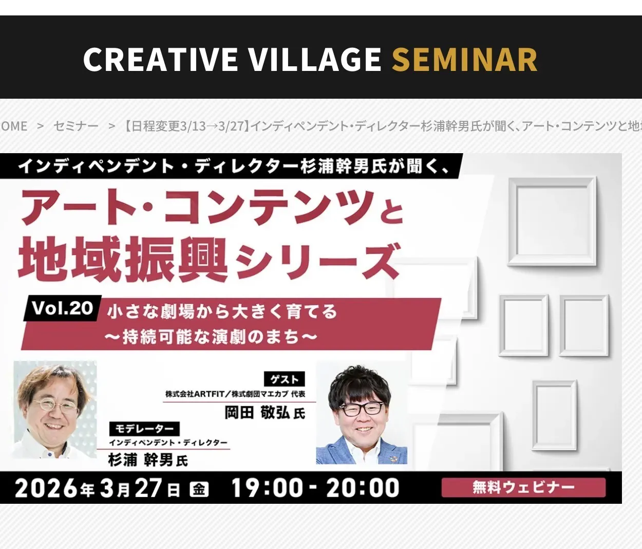 2026/03/27 10:35本日3/27金19時から20時ウェビナー無料開催!アート・コンテンツと地域振興シリーズvol.20 小さな劇場から大きく育てる ~持続可能な演劇のまち~4/6に高松でオープンする「絵本の劇場カメレオン」について、なんで作ったの?どうやってできたの?これから何するの?そのへん全部しゃべります。裏側の話、たぶん面白いです!https://www.creativevillage.ne.jp/category/crv_event/172025/?rls もっと見るオンライントークイベント延期のお知らせ
