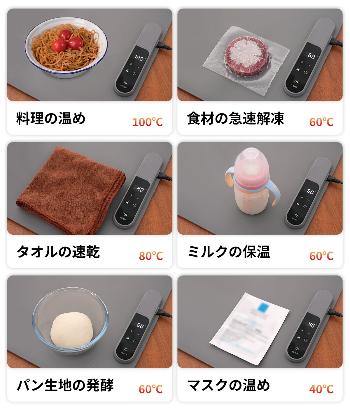 その役割は「温め」だけに留まりません。パン生地の発酵、赤ちゃんミルクの保温、食材の急速解凍、衣類の速乾など、あらゆるシーンに合わせた「ちょうどいい温度」を実現します。